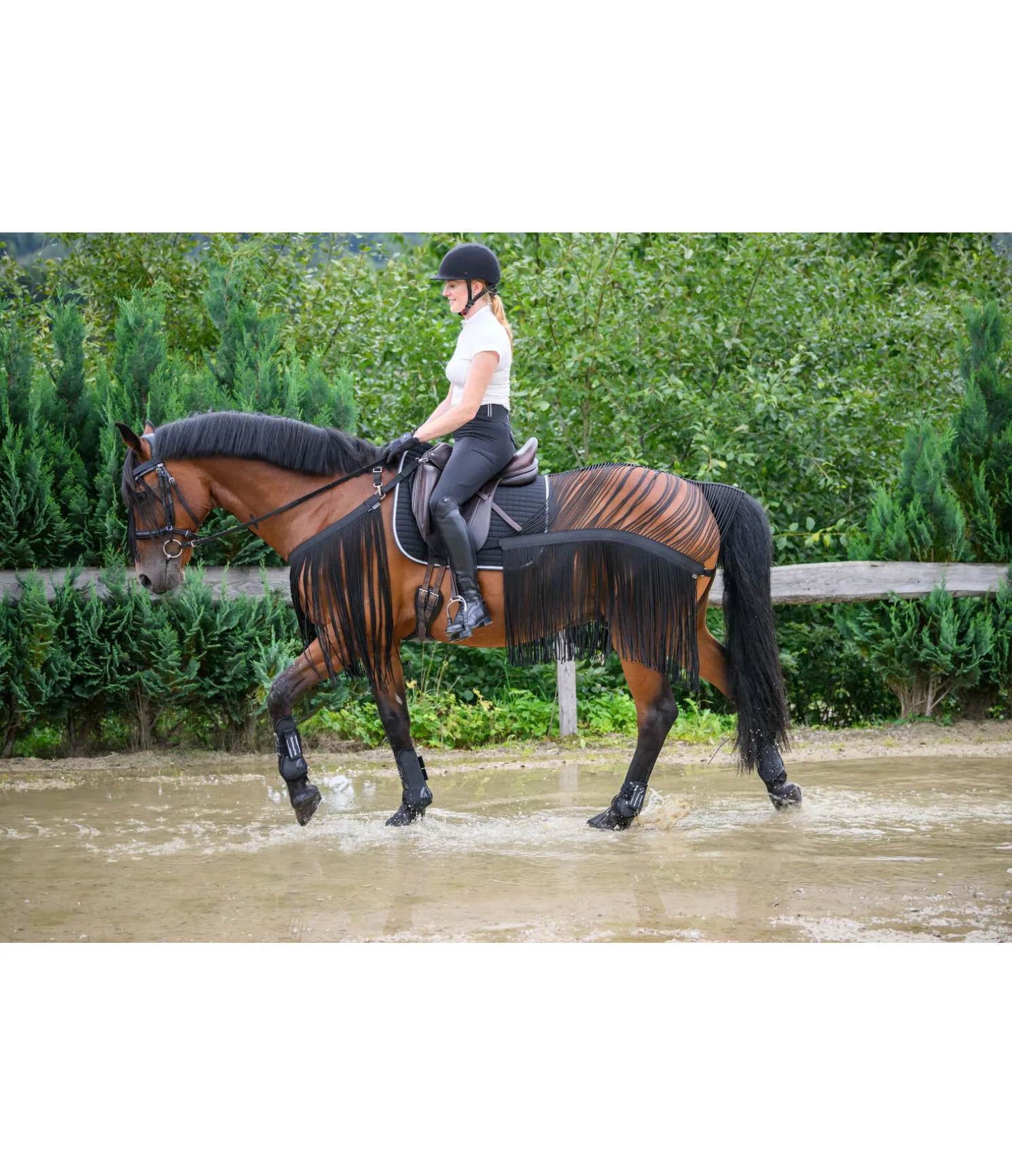 Couvre-reins innovant avec franges anti-mouches au niveau de la croupe et des flancs pour des sorties en toute tranquillité, pour le travail au sol ou pour le travail à la longe. Sangle élastiquée réglable pour fixation par patte auto-agrippante aux oeillets de la selle ou du surfaix. Alternative légère et parfaite à la couverture anti-mouche. Peut être utilisé seul ou assorti au collier de chasse anti-mouches SHOWMASTER pour une protection complète contre les mouches et autres nuisibles. 100 % polyester.