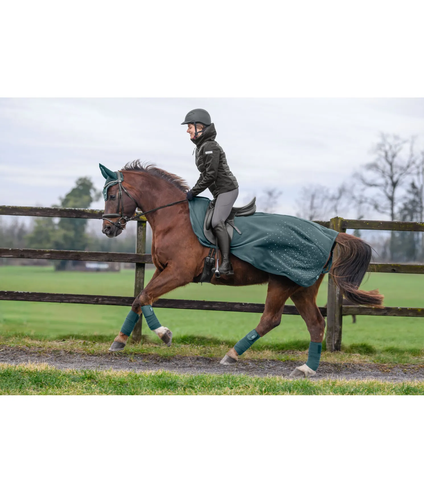Élégant couvre-reins pour protéger les zones sensibles du froid lors des balades et échauffements en hiver avec découpe pour selle anglaise. Large patte auto-agrippante doublée de polaire Teddy devant la selle, pour une mise en place rapide et un maintien sûr. Arrière-main gauche ornée de jolis strass scintillants. Courroie de queue réglable incluse. 100 % polyester.