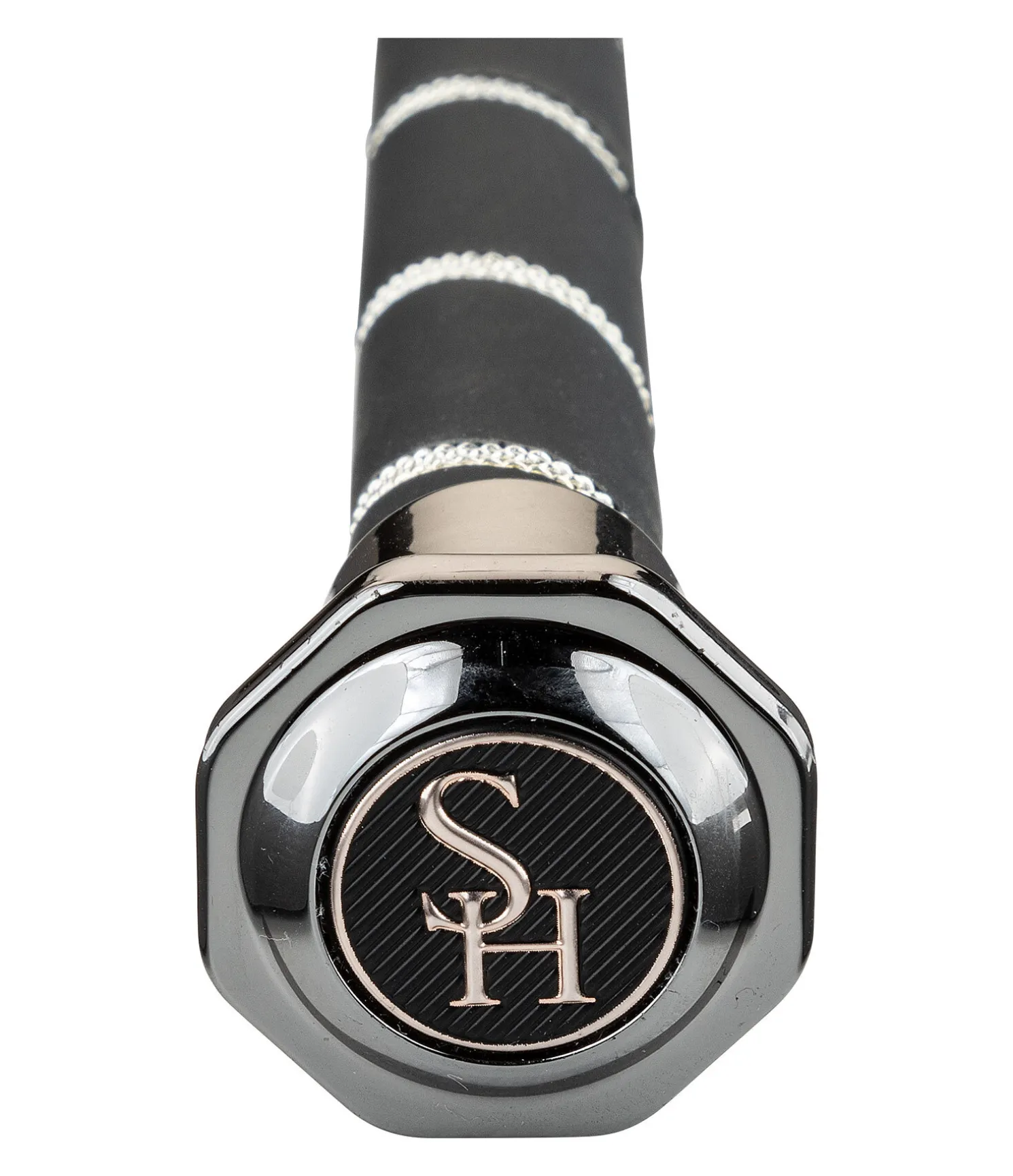 Cravache de dressage élégante avec poignée décorée d’un cordon torsadé argenté. Pommeau hexagonal avec badge logo. Tige en fibre de verre avec revêtement en nylon.