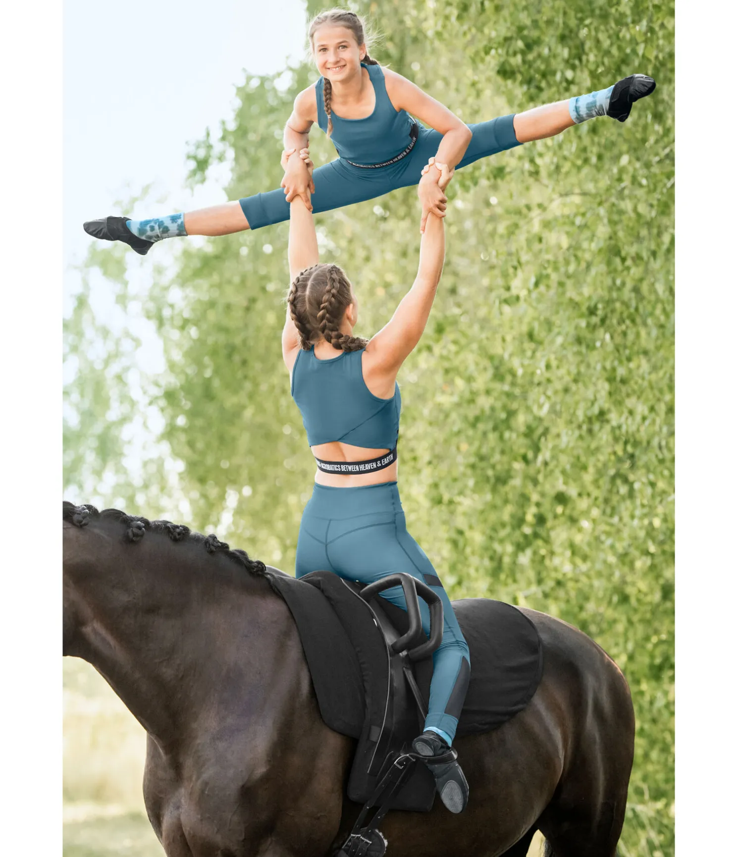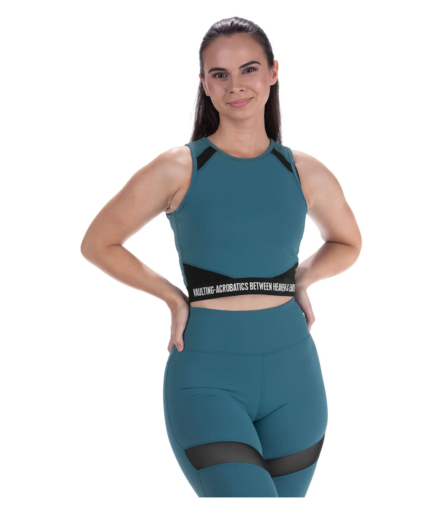 Crop top près du corps avec larges bretelles. Inserts en mesh, au niveau des côtes et des épaules, favorisant la circulation de l’air. Matière respirante et à séchage rapide. Brassière de sport intégrée avec coques amovibles pour un maintien optimal. Il est conseillé de retirer les coques avant le lavage. Bande élastiquée à la taille avec inscription brodée « Vaulting – Acrobatics between heaven & earth ». Découpe croisée travaillée dans le dos. 88 % polyester, 12 % élasthanne (carbone chiné) et 78 % polyester, 22 % élasthanne (aquamarine).