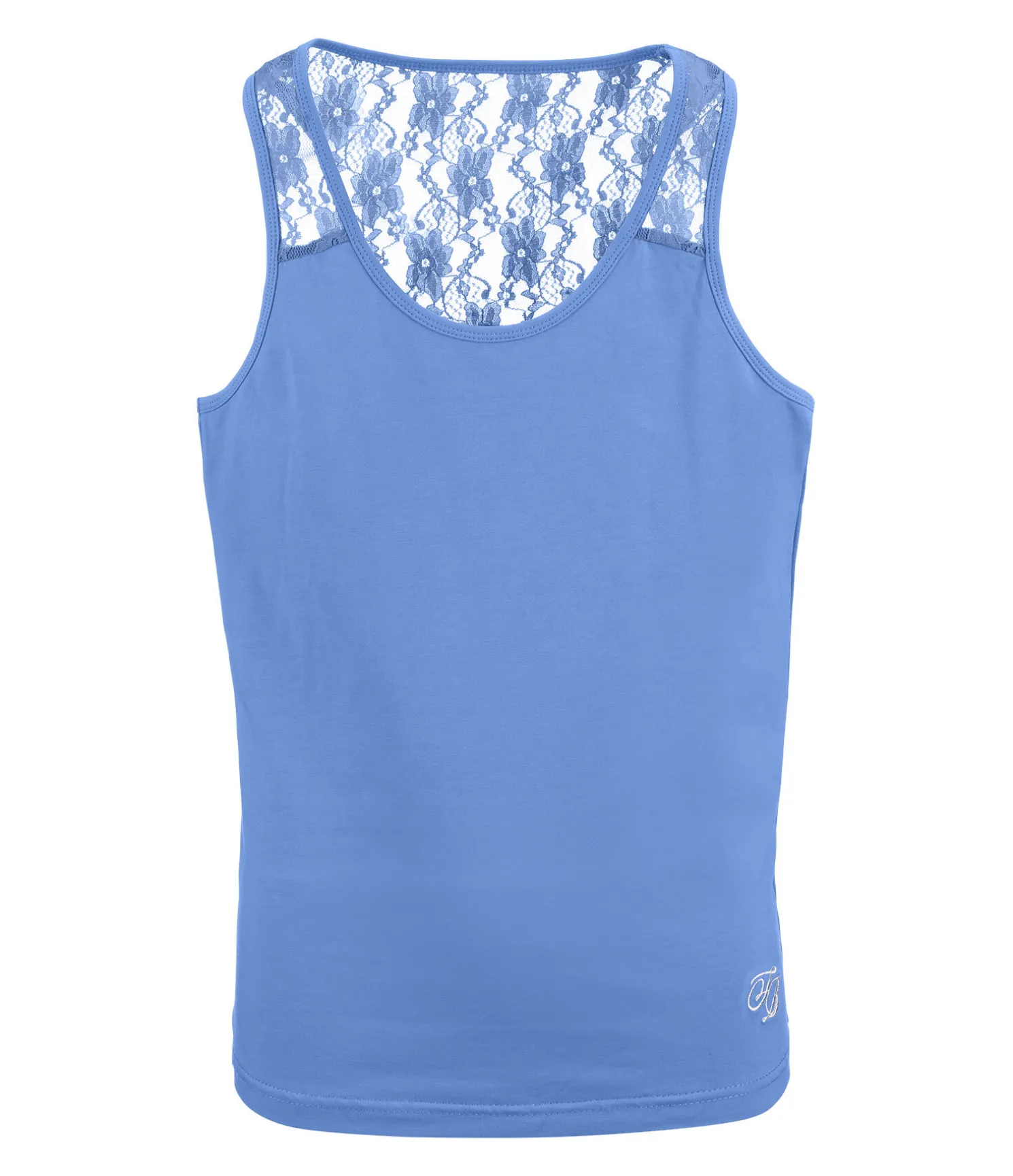 Adorable débardeur pour enfant avec joli insert en dentelle aux épaules et dans le dos. Broderie logo discrète. Matière respirante. 95 % coton, 5 % jersey extensible.
