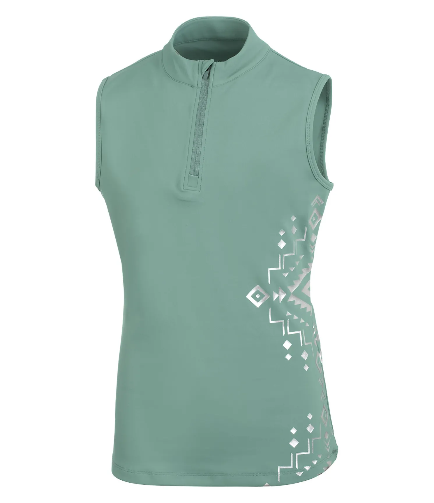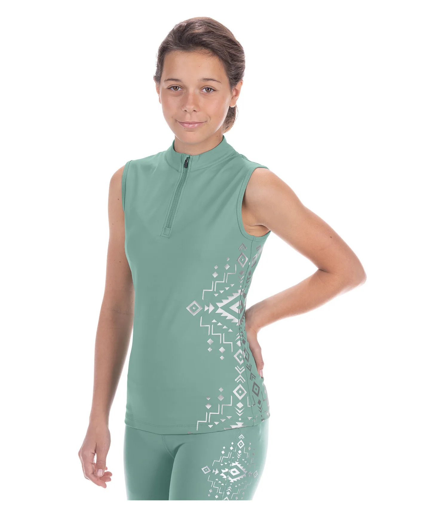 Débardeur pour enfant et adolescent. Coupe près du corps. Col montant zippé avec protège-menton. Matière respirante à séchage rapide. Imprimé argenté métallisé de chaque côté. 78 % polyester, 22 % élasthanne.