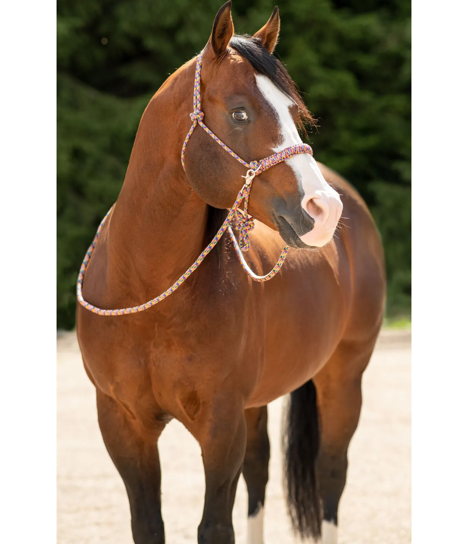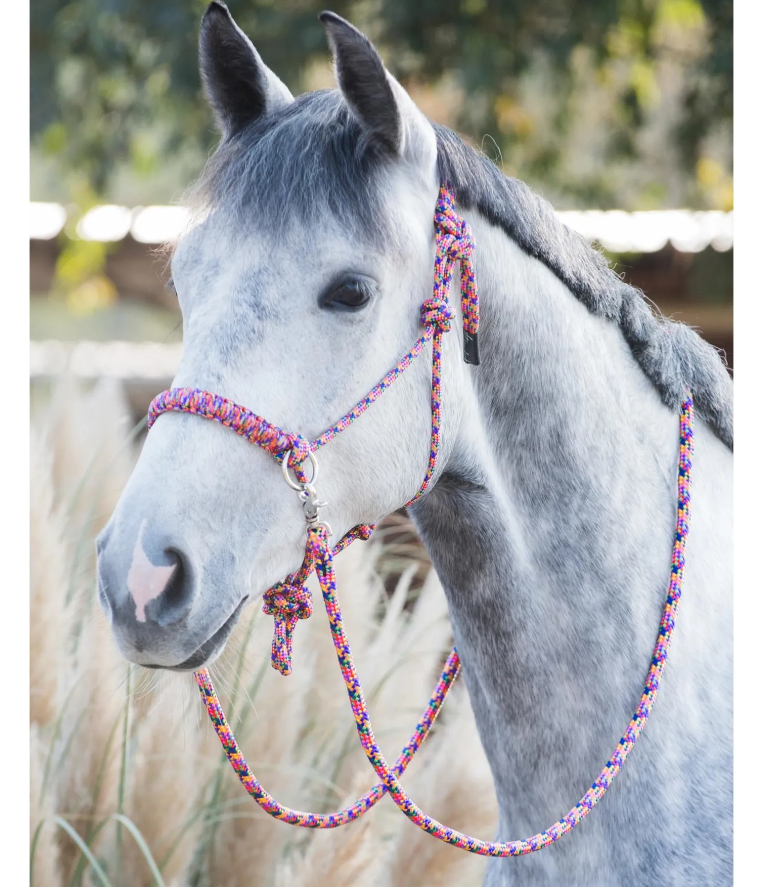 Licol à noeuds haut de gamme. Pour le travail au sol ou monté. En matière souple et résistante. Avec anneaux pour les rênes et muserolle tressée. Épaisseur de la corde 8 mm. Livré avec rênes à mousquetons et longe assorties. Longueur des rênes, mousquetons compris 2,6 m, épaisseur des rênes et de la longe 16 mm. Longueur de la longe 2,4 m.