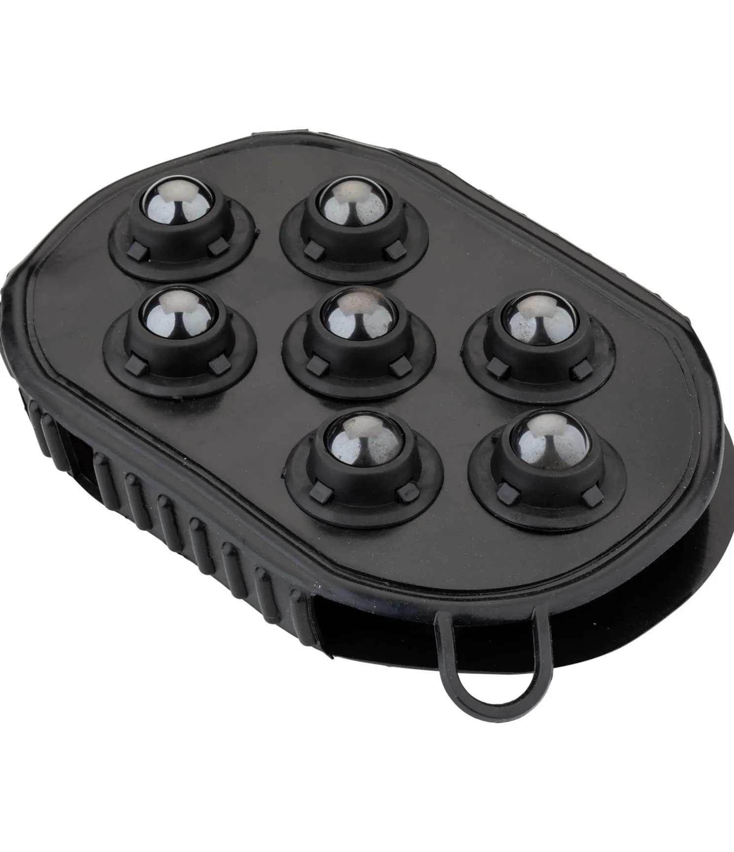 Avec billes de massage magnétiques sur une face et picots en caoutchouc sur l’autre face. 15,5 x 10,5 cm.