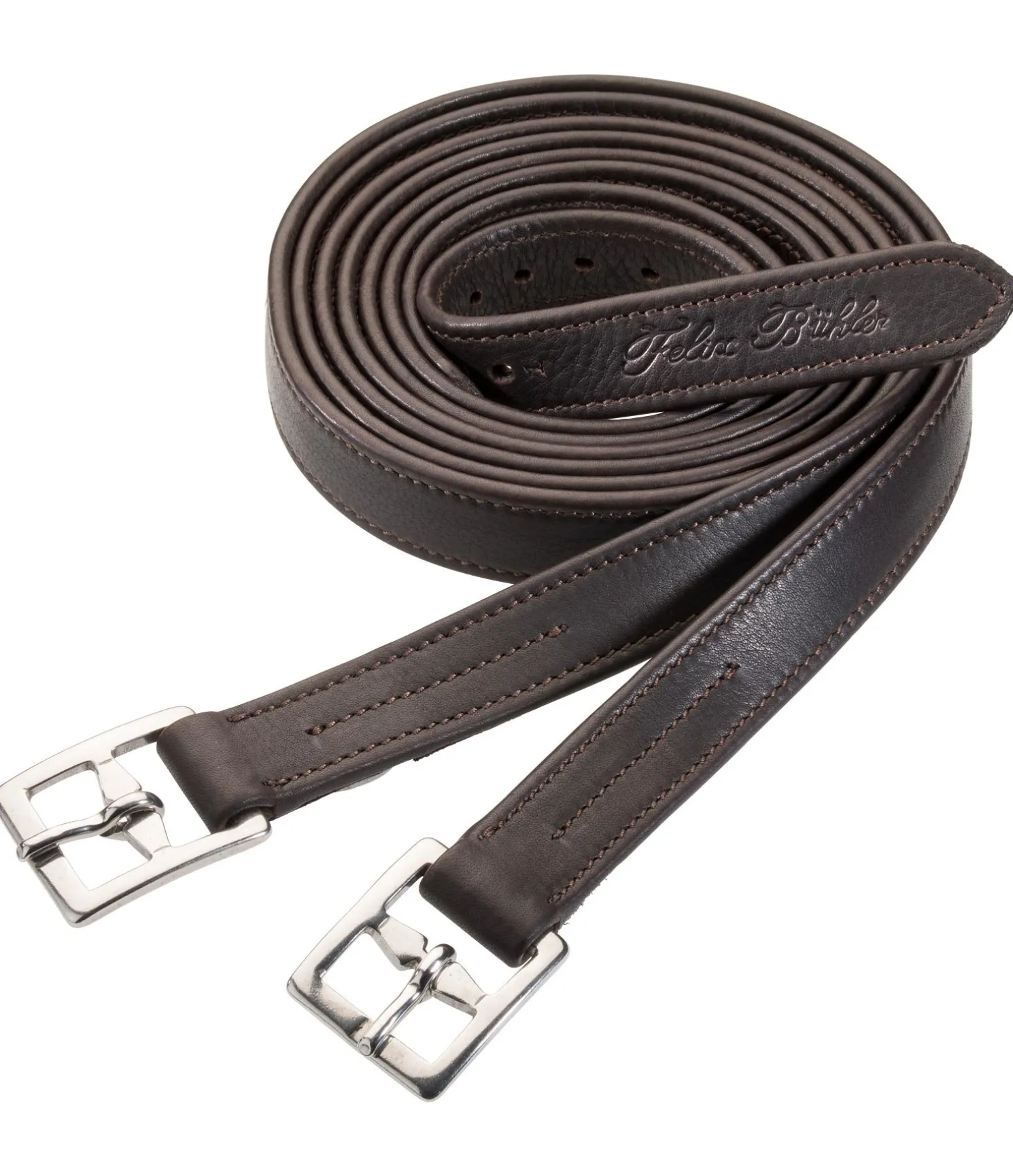 Étrivières de grande qualité en cuir de veau souple ciré. Extrêmement résistantes à la déchirure grâce à une coeur en nylon. Boucles argentées en acier inoxydable légèrement incurvées. Largeur 2,5 cm. Vendues par paire.