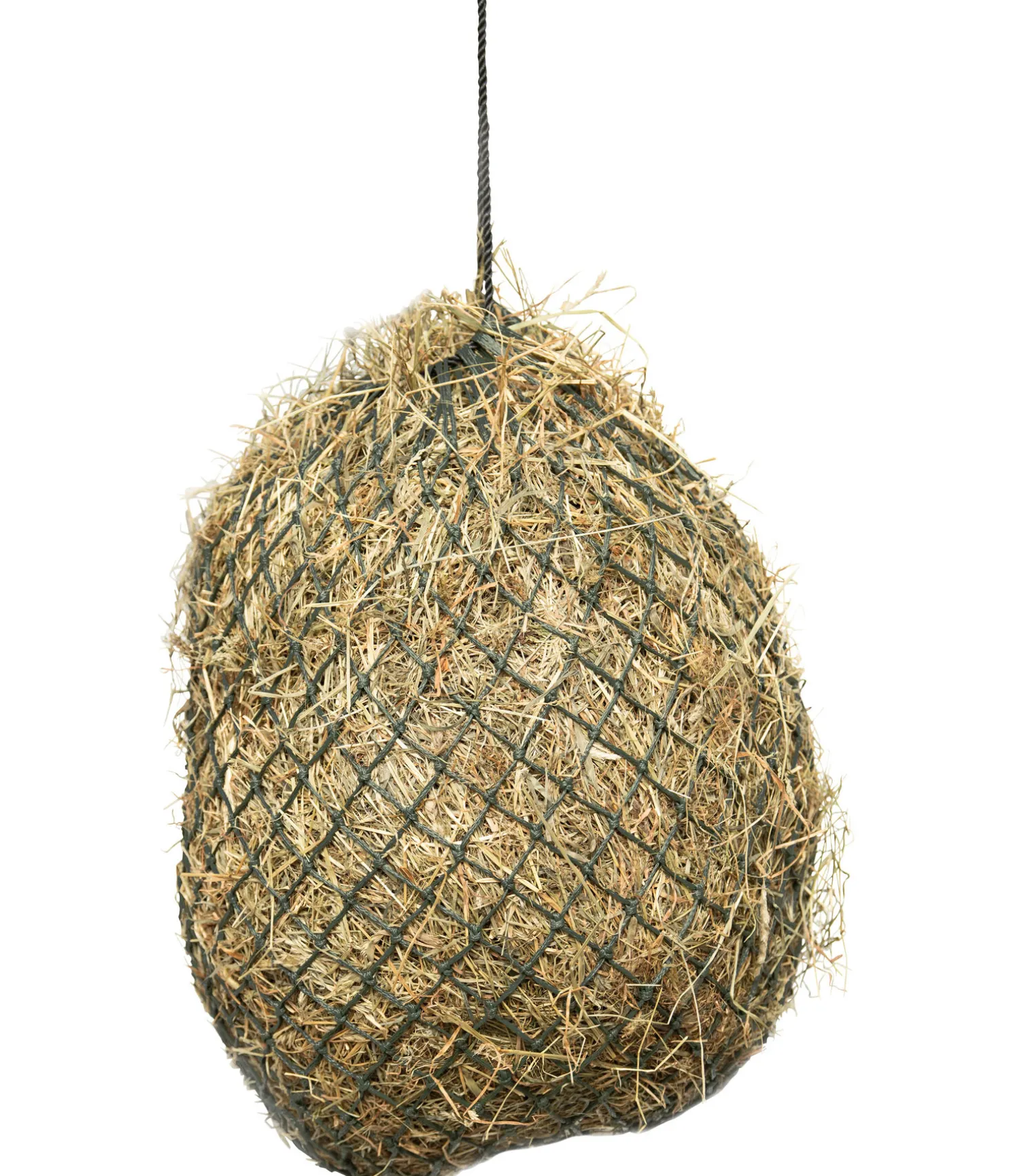 Filet à foin en polypropylène. Dimensions des mailles : 3 x 3 cm. Dimensions du filet vide : 90 x 90 cm. Capacité 4 kg.
