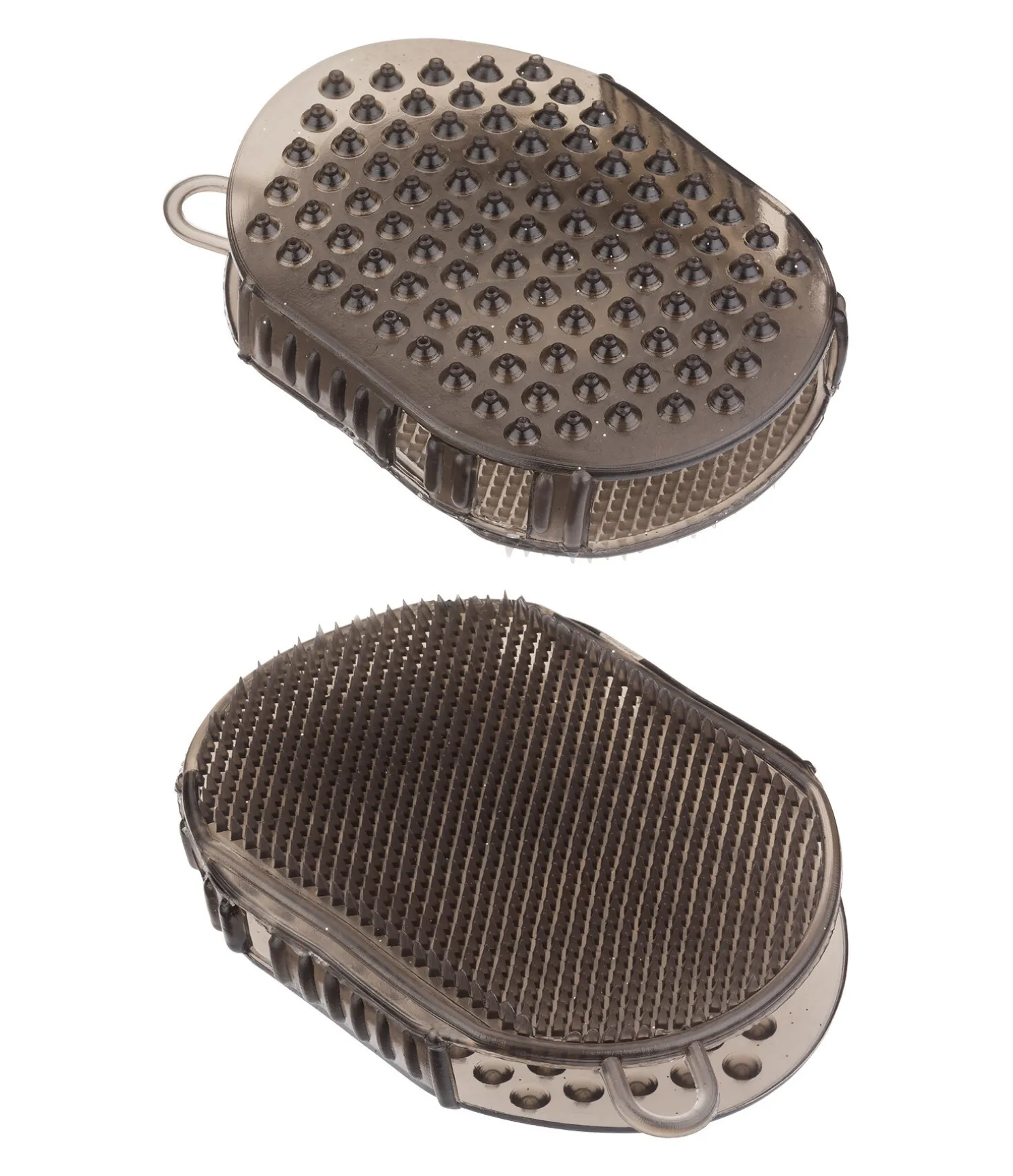 Gant de massage en caoutchouc transparent avec un léger effet pailleté. Idéal pour les soins quotidiens de la robe et les massages. Un côté à petits picots et un côté à gros picots.