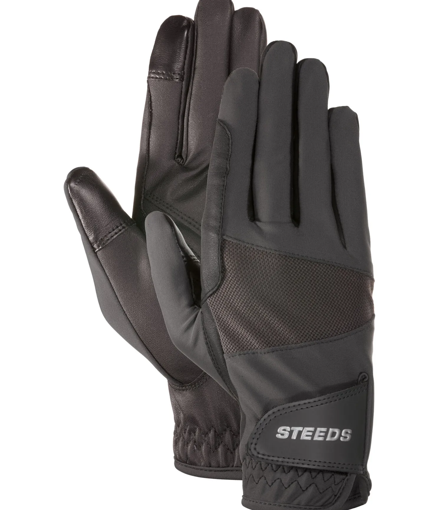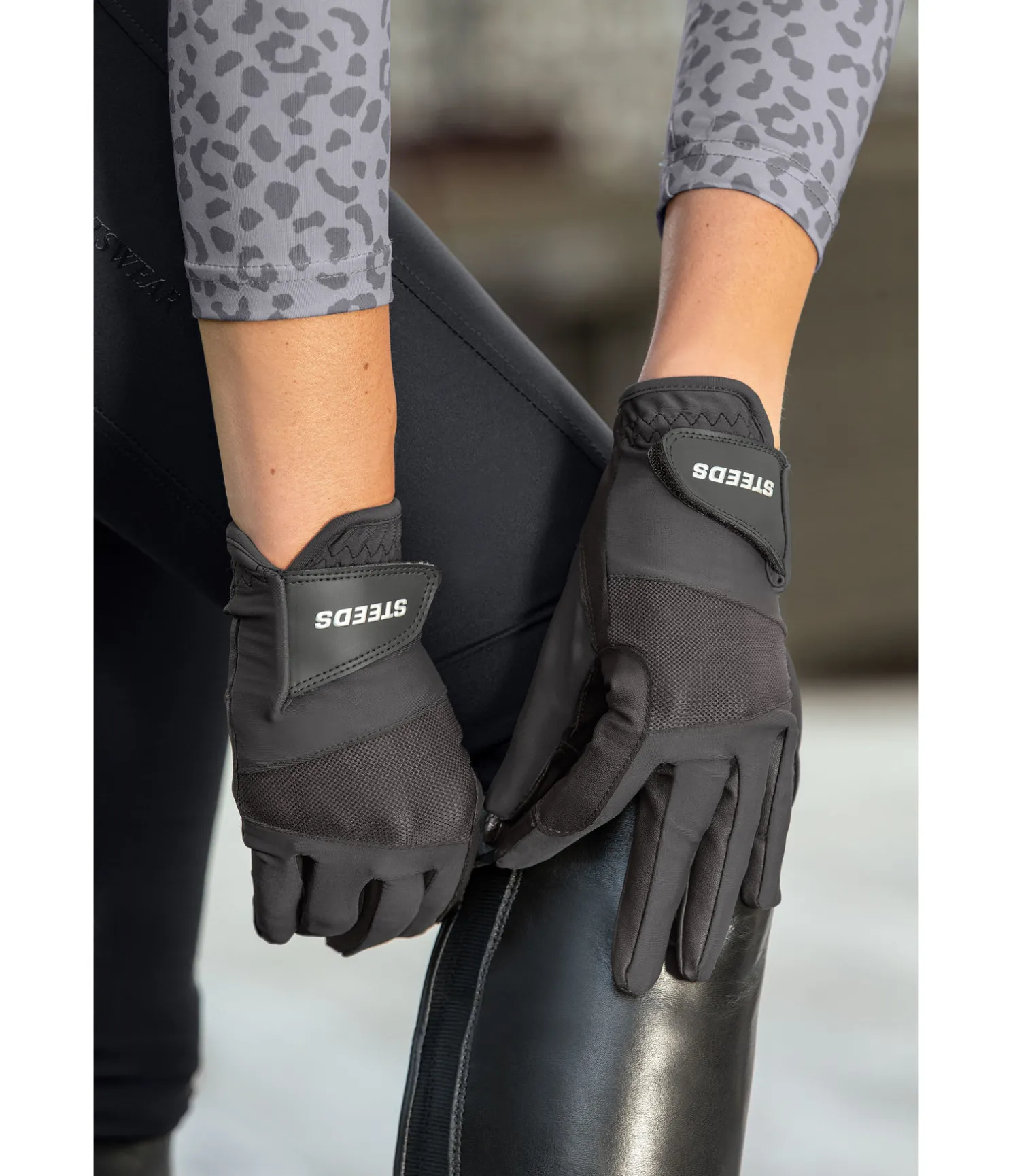 Gants d’équitation d’été légers au look sportif. Dos de la main extensible en tissus mesh respirant et en nylon fin. Paume antidérapante en matière PU pour une bonne prise en main des rênes. Poignets élastiqués avec logo STEEDS métallisé imprimé sur la fermeture auto-agrippante. Renforts aux passages de rênes. Dessus : 70 % nylon, 30 % élasthanne. Paume: 80 % polyuréthane, 20 % polyester.