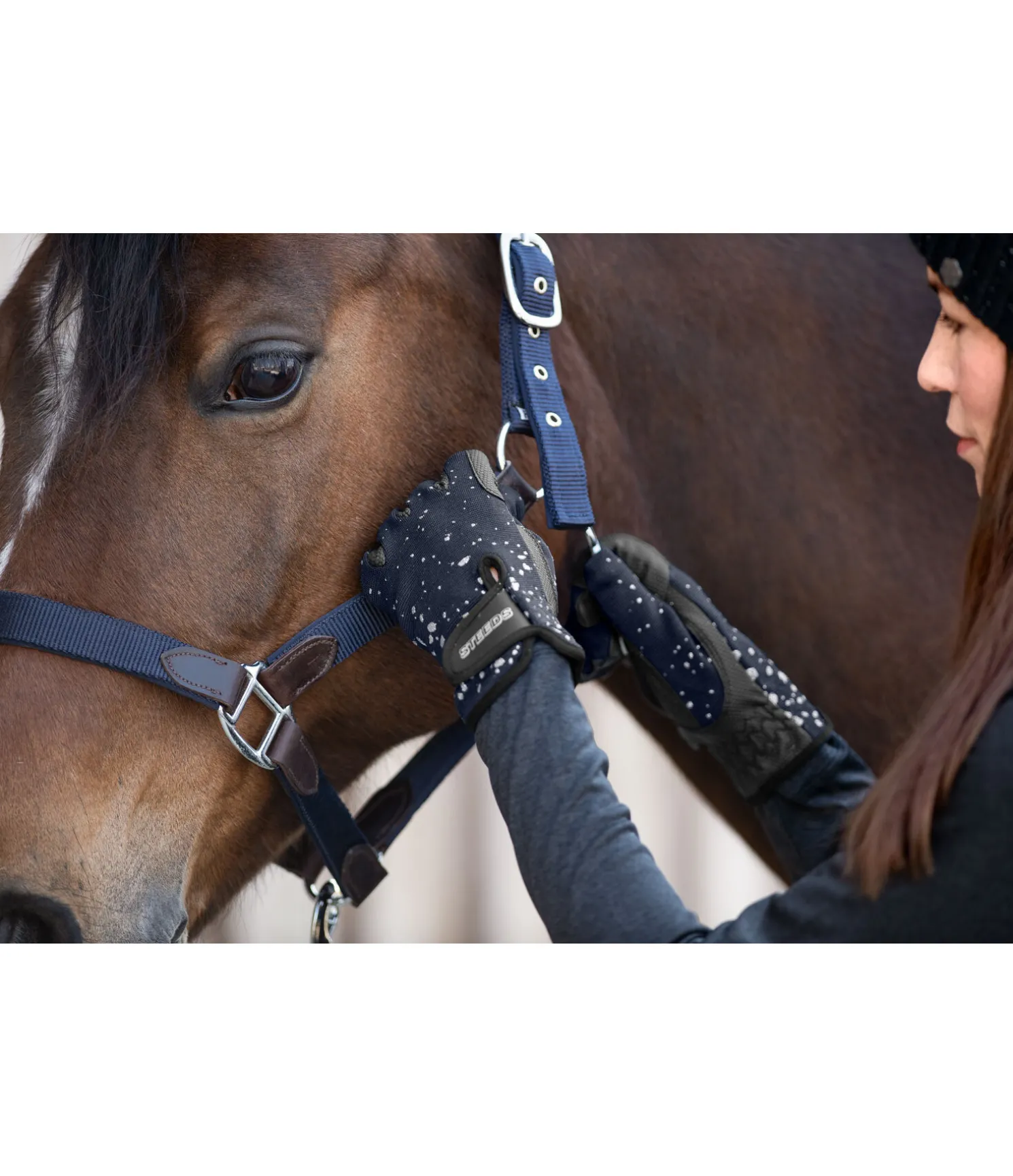 Gants d’équitation d’hiver chics avec imprimé pailleté argenté et dos de la main extensible. Doublure polaire chaude et poignets élastiqués avec patte auto-agrippante. Dessus 80 % nylon, 20 % élasthanne. Paume 80 % polyuréthane, 20 % polyester. Doublure 100 % polyester.