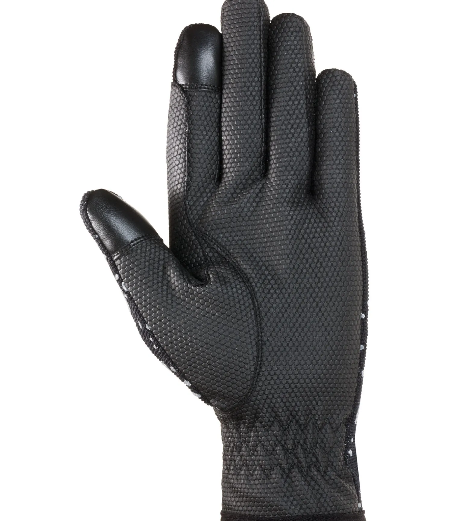 Gants d’équitation d’hiver chics avec imprimé pailleté argenté et dos de la main extensible. Doublure polaire chaude et poignets élastiqués avec patte auto-agrippante. Dessus 80 % nylon, 20 % élasthanne. Paume 80 % polyuréthane, 20 % polyester. Doublure 100 % polyester.