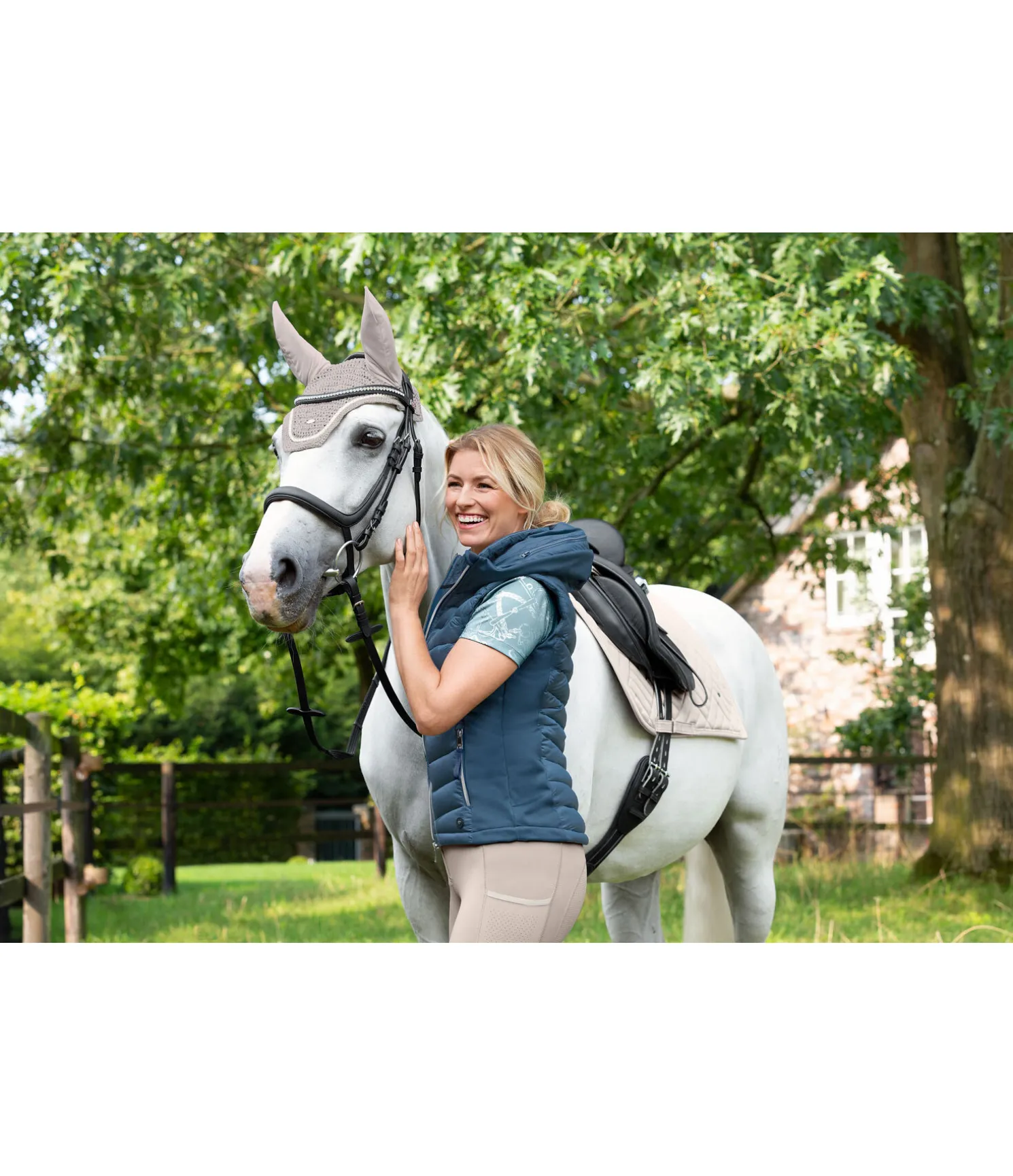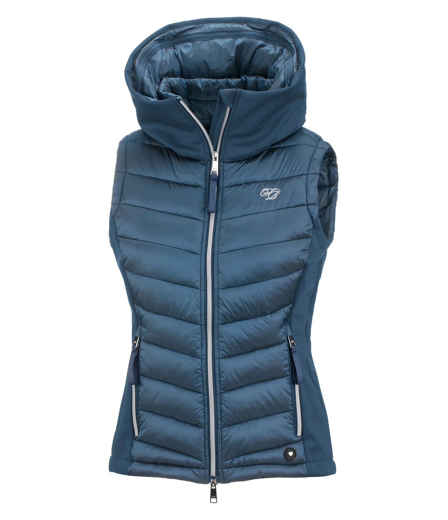 Gilet d’équitation bi-matière élégant. Coupe-vent. Matelassage doux et brillant avec garnissage léger. Col montant et côtés en softshell extensible. Capuche matelassée qui se range dans le large col zippé. Fermeture à glissière double sens brillante avec sous-patte et protège-menton. Deux poches latérales zippées. Taille réglable. Matelassage 100 % nylon ; softshell 92 % polyester, 8 % élasthanne.