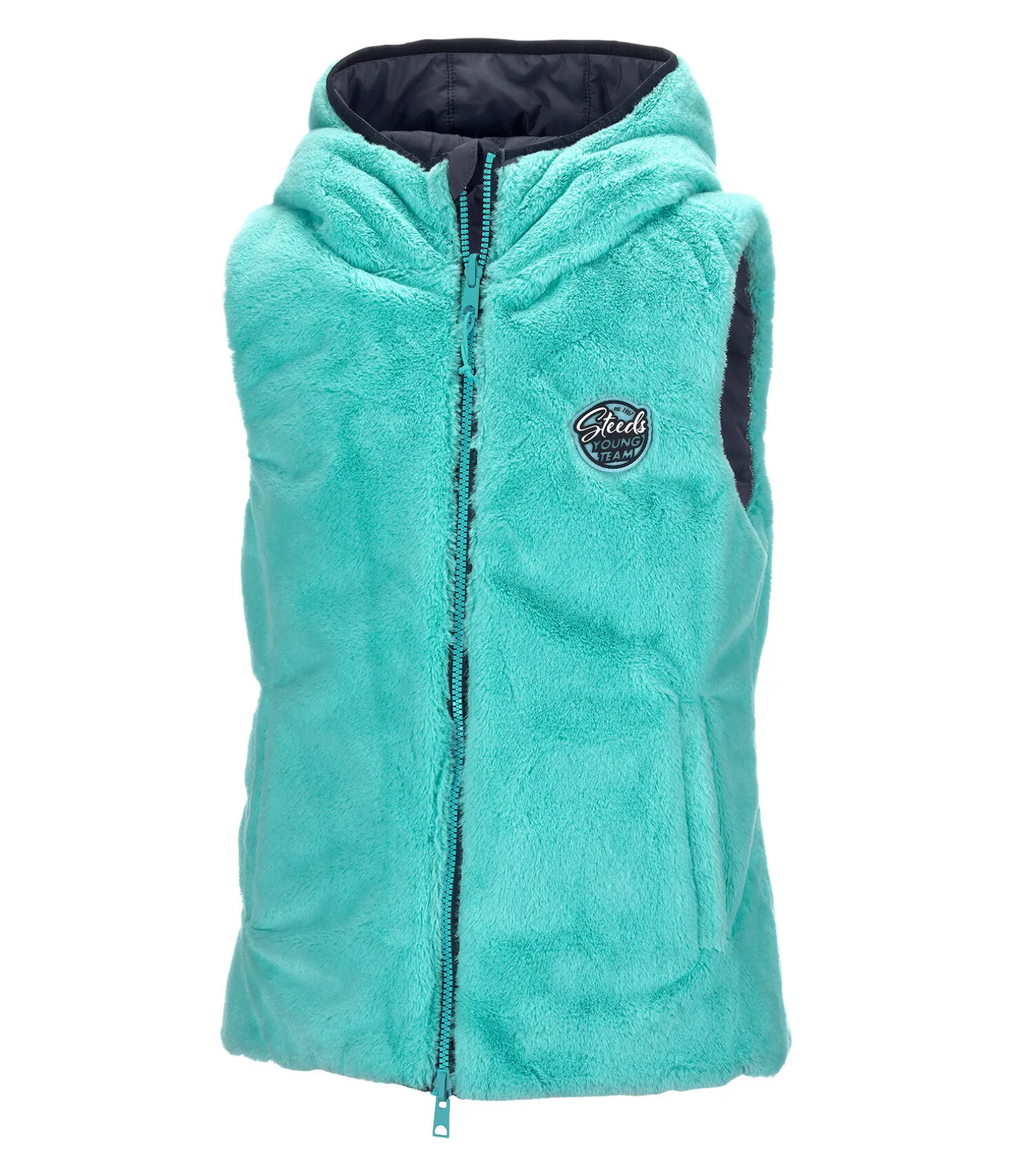 Gilet d’équitation réversible à capuche. Idéal pour les changements de temps. Un côté en polaire Teddy douce et un côté matelassé. Logo sur la poitrine de chaque côté. Fermeture à glissière bidirectionnelle de couleur contrastante avec protège-menton. Deux poches zippées dissimulées sur la face matelassée et non zippées sur la face polaire. 100 % polyester.