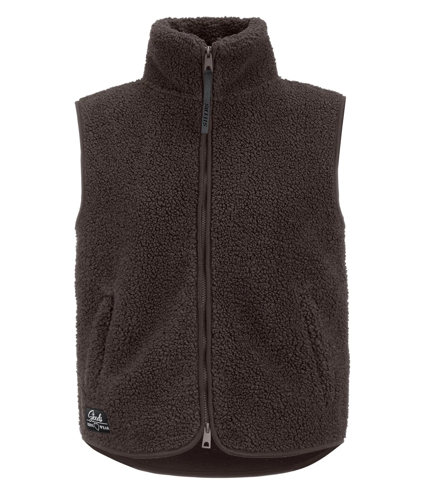 Gilet en polaire Teddy douce et extensible. Col montant. Coupe plus longue à l’arrière. Fermeture à glissière double sens avec sous-patte. Deux poches zippées latérales dissimulées. Étiquette STEEDS à la taille. 100 % polyester.