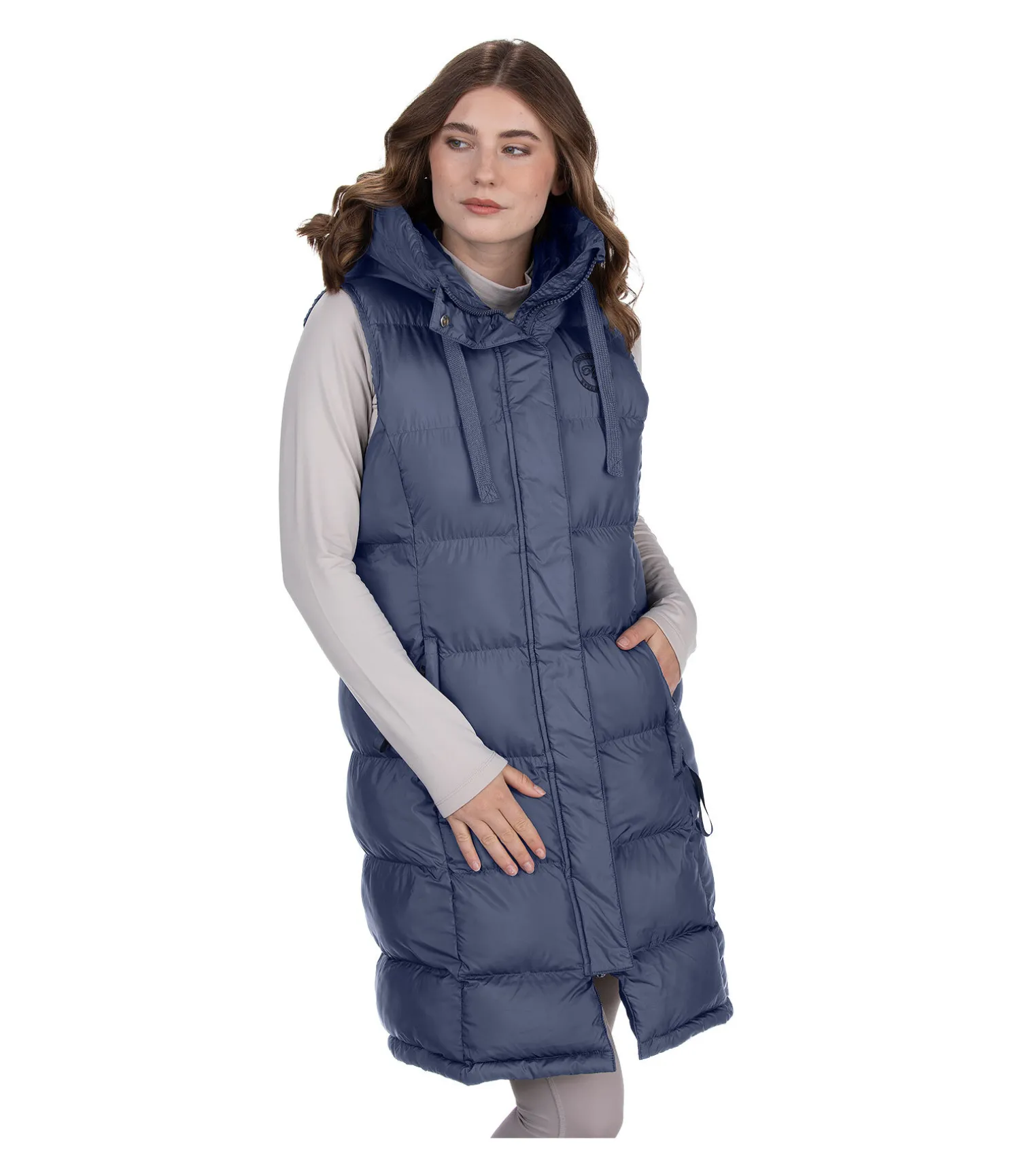 Gilet d’équitation long à capuche. Garnissage doux imitation duvet. Capuche haute réglable avec système d’attache dans le dos. Fermeture à glissière double sens dissimulée. Deux poches latérales zippées dissimulées doublées en polaire douce. Longue fente cavalière zippée avec sous-patte à l’arrière. Broderie Felix Bühler sur la poitrine. 100 % Polyester.