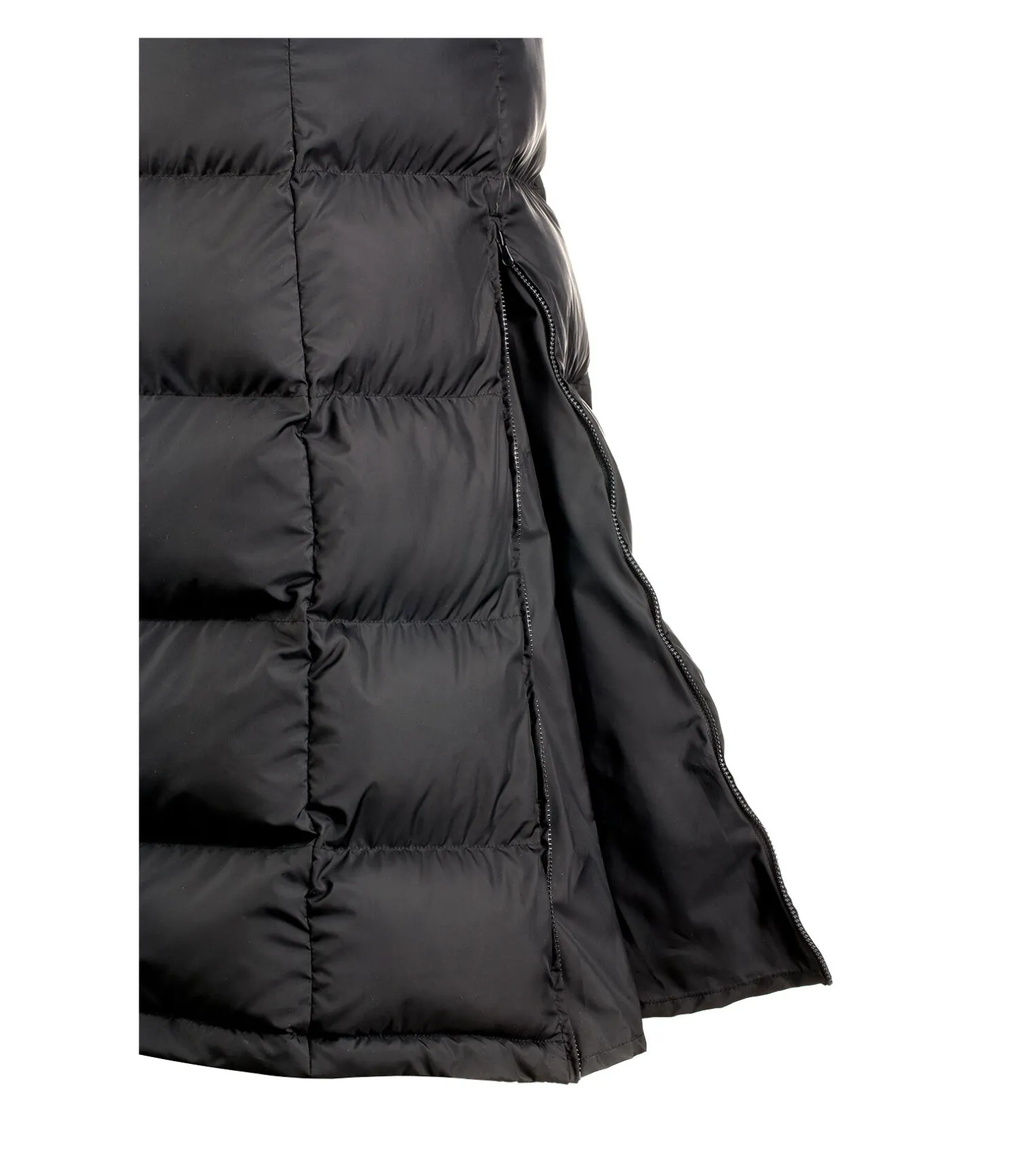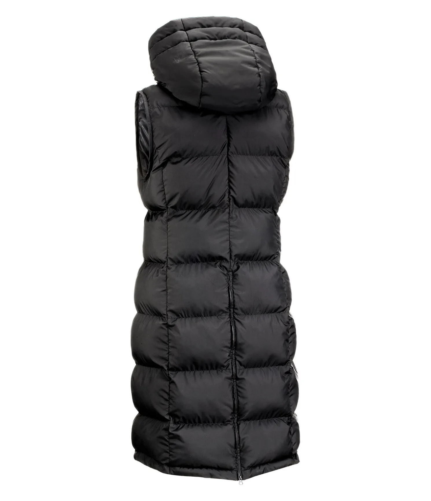 Gilet d’équitation long à capuche. Garnissage doux imitation duvet. Capuche haute réglable avec système d’attache dans le dos. Fermeture à glissière double sens dissimulée. Deux poches latérales zippées dissimulées doublées en polaire douce. Longue fente cavalière zippée avec sous-patte à l’arrière. Broderie Felix Bühler sur la poitrine. 100 % Polyester.