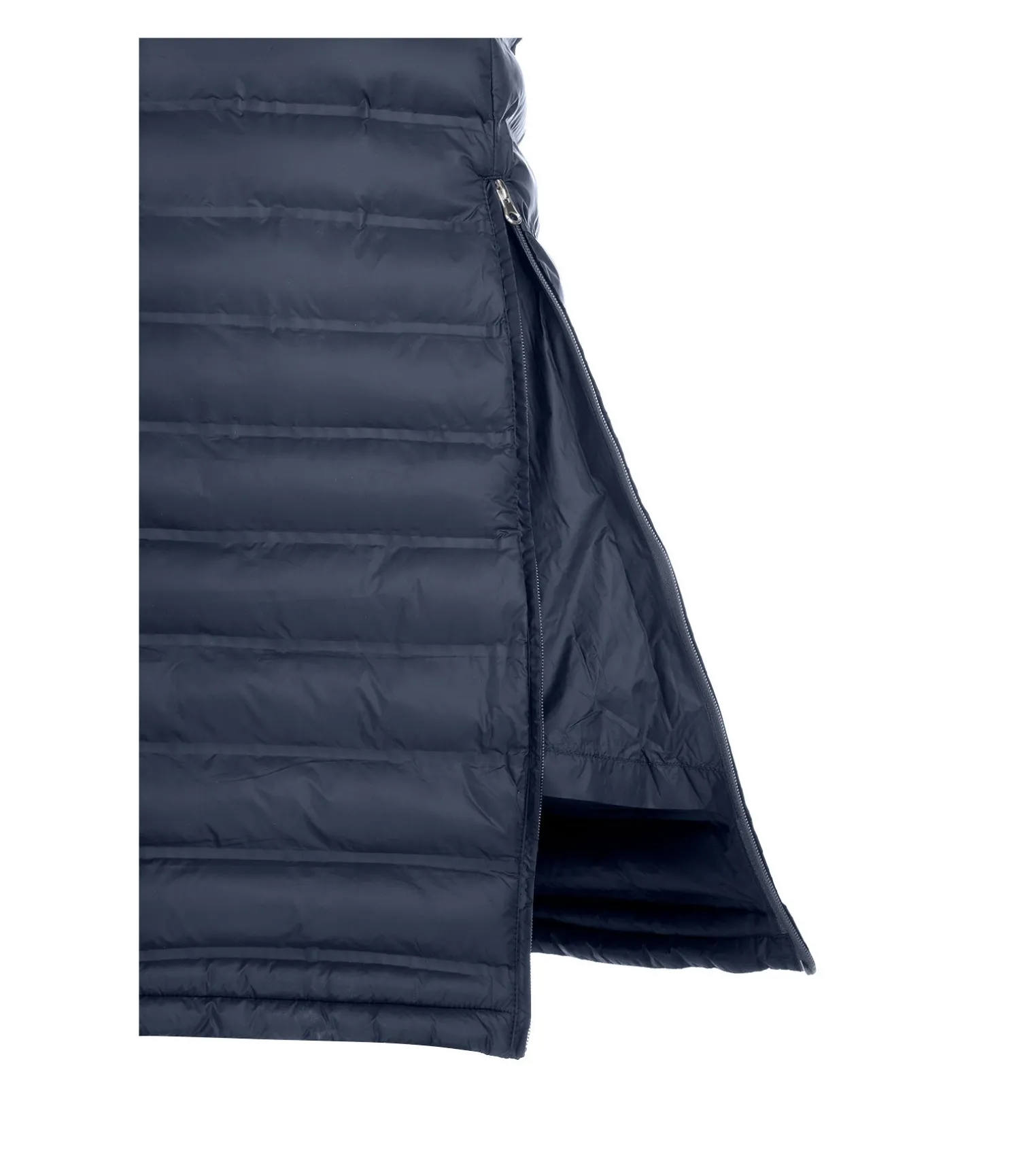 Gilet long léger matelassé avec coutures thermosoudées. Garnissage léger en imitation duvet. La capuche peut se ranger dans le col, s’enlever facilement grâce à la fermeture à glissière ou se fixer dans le dos grâce au bouton-pression. Longue fente cavalière zippée à l’arrière, fermeture à glissière double sens avec sous-patte et protège-menton, 2 poches zippées à l’avant. Badge Felix Bühler sur la poitrine. Poignets élastiqués. 100 % nylon.