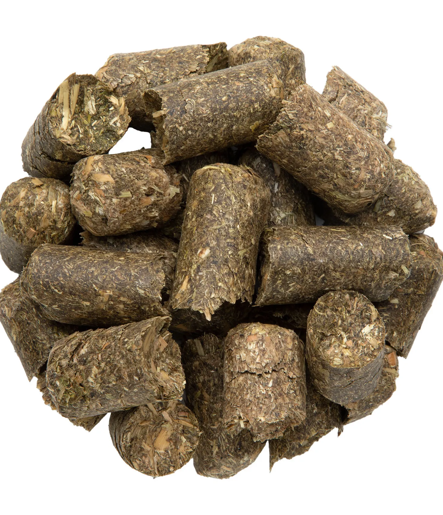 Granulés de foin adaptés aux distributeurs automatiques ou à donner directement. Grâce à leur compactage, les granulés de foin exigent une bonne mastication ainsi qu’une bonne salivation, ce qui ralentit l’ingestion. En alternative au foin ou en tant qu’aliment complet pour les chevaux allergiques, car sans poussière et stimulant l’appétit. Les granulés peuvent aussi être ramollis dans l’eau si besoin (le temps de ramollissement est plus long qu’avec les granulés de foin doux). Produits à partir de pousses de prairie et sans additifs.