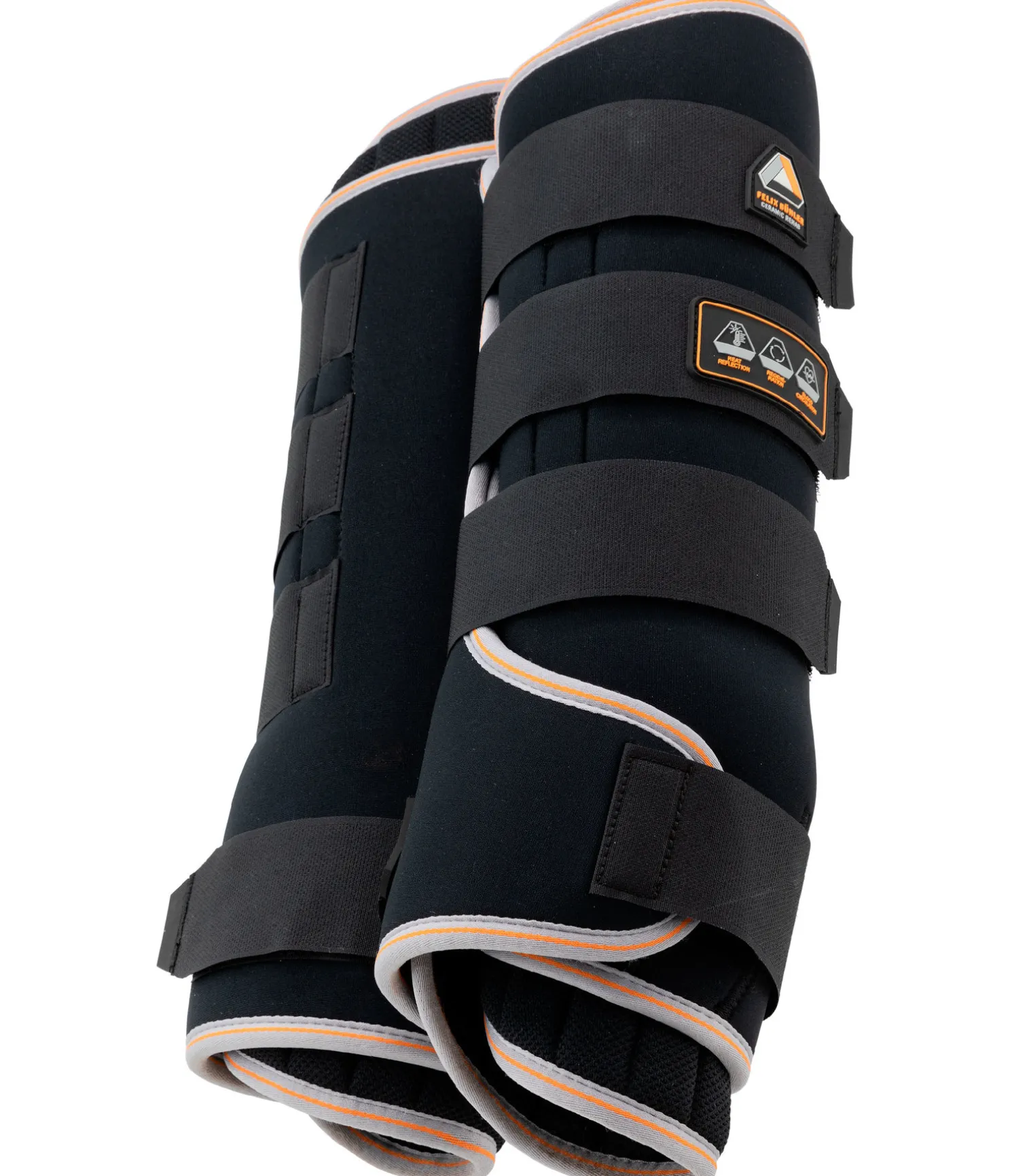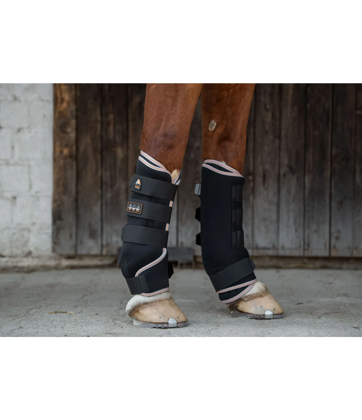 Guêtres d’écurie relaxantes avec doublure moelleuse en caoutchouc-chloroprène souple. À l’intérieur, un coussin contenant des fibres de céramique qui réfléchissent la chaleur corporelle et améliorent sensiblement la circulation sanguine s’ajuste parfaitement grâce aux pattes auto-agrippantes. Peuvent accélérer la guérison et réduire les douleurs liées à des maladies chroniques de l’appareil locomoteur. Idéales en cas d’arthrose, d’éparvins ou de nécrose de la pince, surtout pour éviter une mise en route « à froid » après une nuit au box. Coupe particulièrement longue qui descend jusqu’à la couronne pour une protection optimale. Forme anatomique. 4 pattes auto-agrippantes pour un ajustement et maintien parfaits. Convient pour les antérieurs et les postérieurs. Lavables en machine à 30° C (veillez à fermer les pattes auto-agrippantes avant le lavage). Ne pas mettre au sèche-linge. 100 % nylon, doublure 100 % caoutchouc-chloroprène. Vendues par paire.