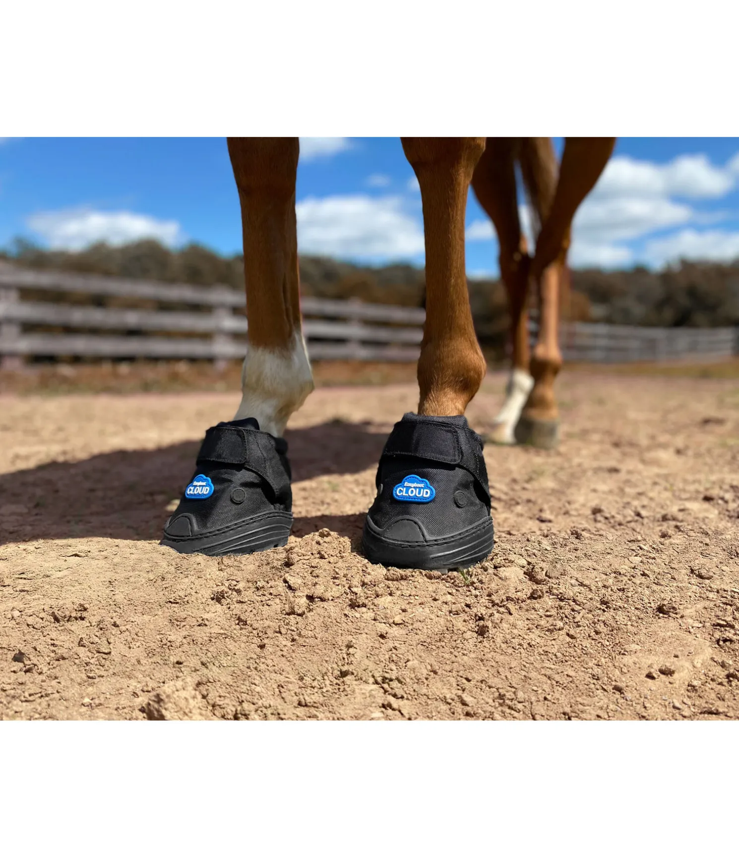 Hipposandale vétérinaire ou thérapeutique pour les chevaux aux sabots sensibles ou atteints de fourbure ou d’abcès. La semelle en mousse EVA fournie permet de rehausser le talon afin de soulager la pression sur la fourchette (écart de 15 mm : hauteur de 10 mm à l’avant et 25 mm à l’arrière). Autre option : insérer une semelle de confort plate EasyCare (431 360 ou 431 361 à acheter séparément). L’hipposandale Easyboot Cloud peut aussi être utilisée comme protection lors du transport. Matière extérieure en tissu doux, résistant et facile à nettoyer. Semelle crantée en caoutchouc résistant à l’abrasion. Vendue à l’unité.