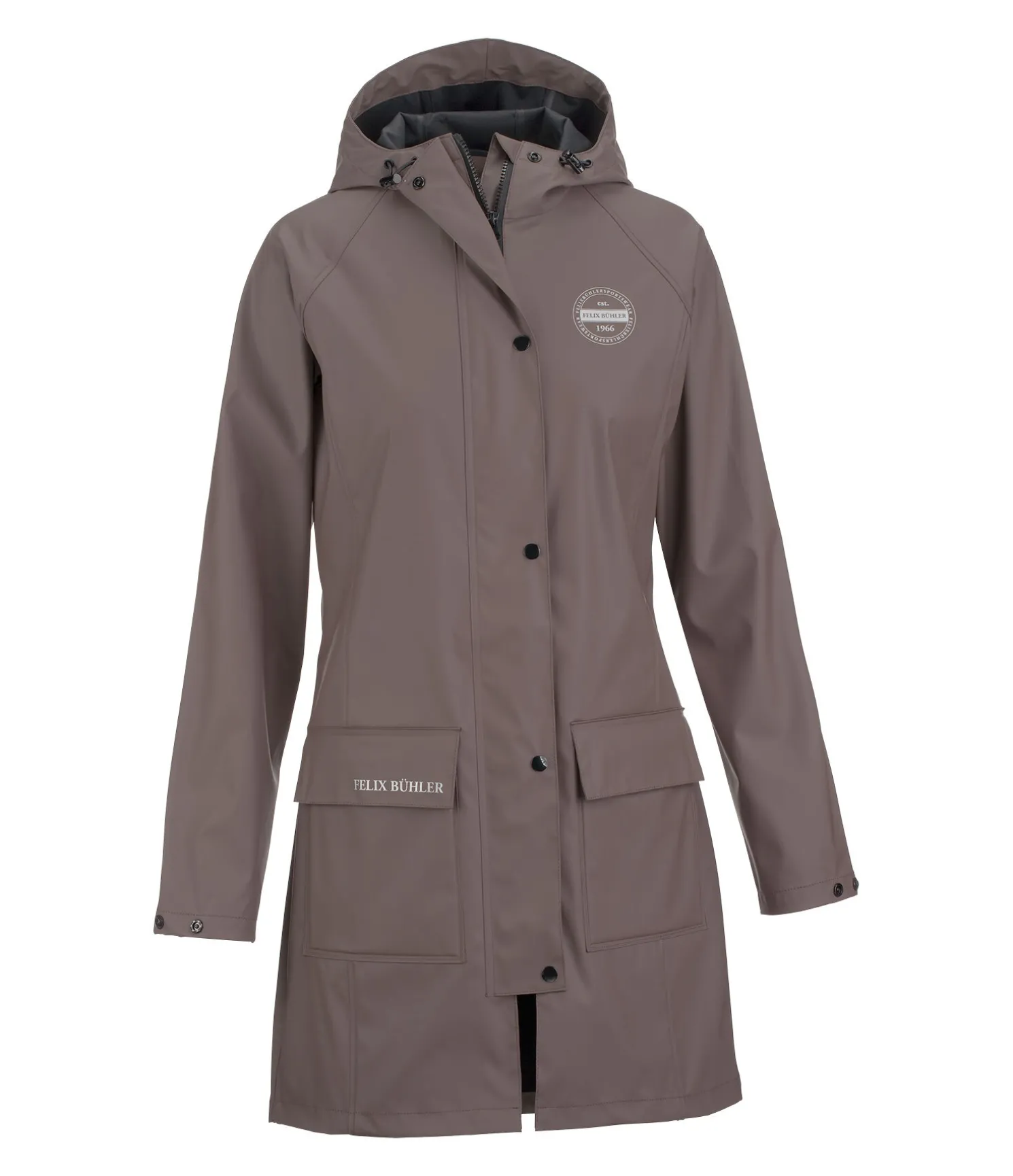 Imperméable (5.000 mm) et coupe-vent d’équitation long. Intérieur de couleur contrastante. Fermeture à glissière double sens dissimulée avec protège-menton. 2 fentes cavalières avec boutons-pression dans le dos. 2 poches à rabat. Capuche et bas des manches réglables. Imprimés réfléchissants à l’avant et l’arrière. 100 % polyuréthane.