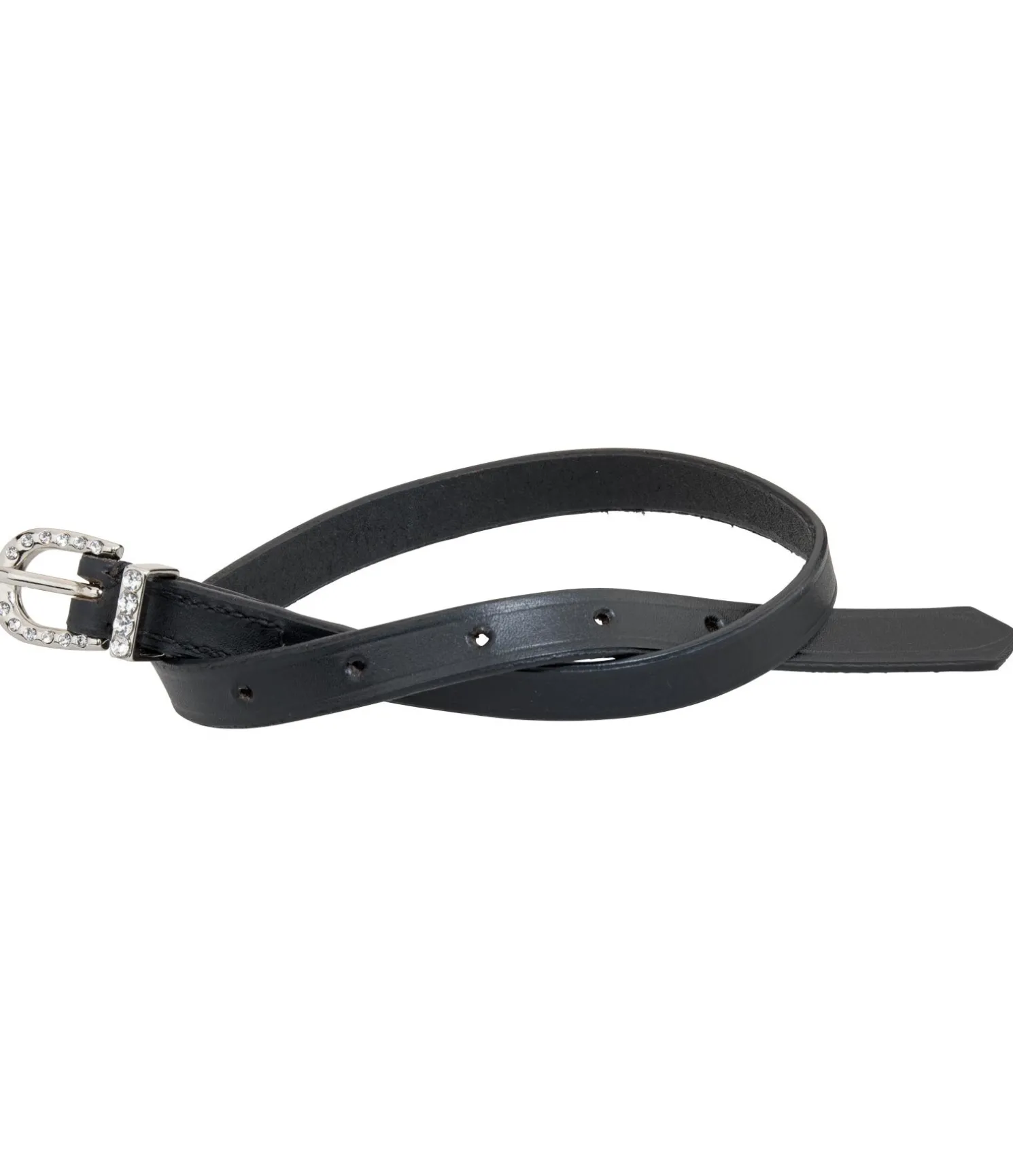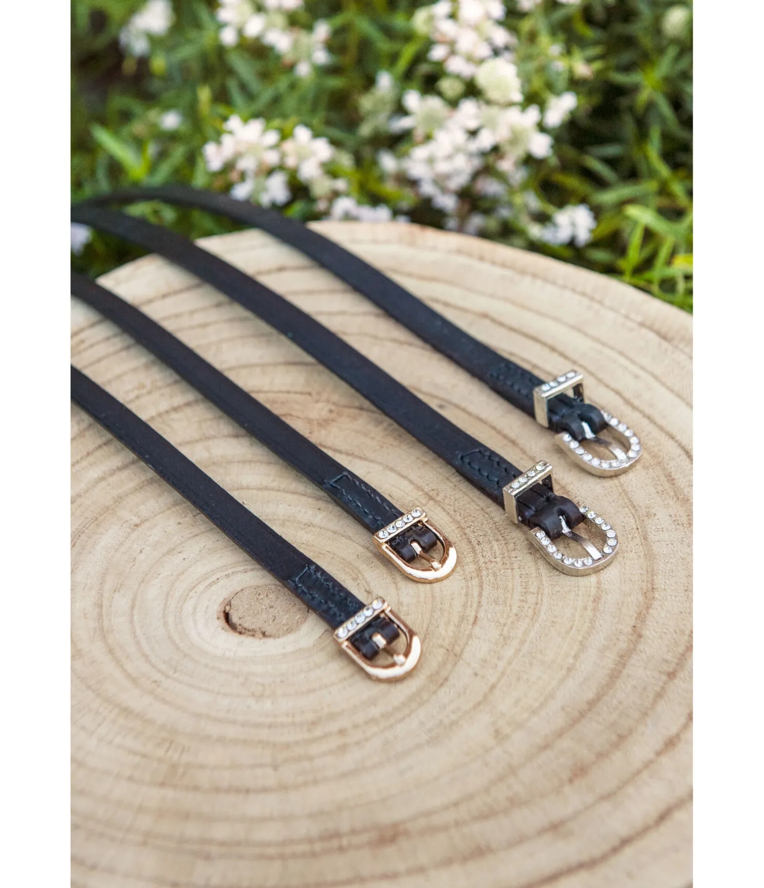 Lanières d’éperons en cuir de grande qualité avec boucles ornées de strass étincelants.