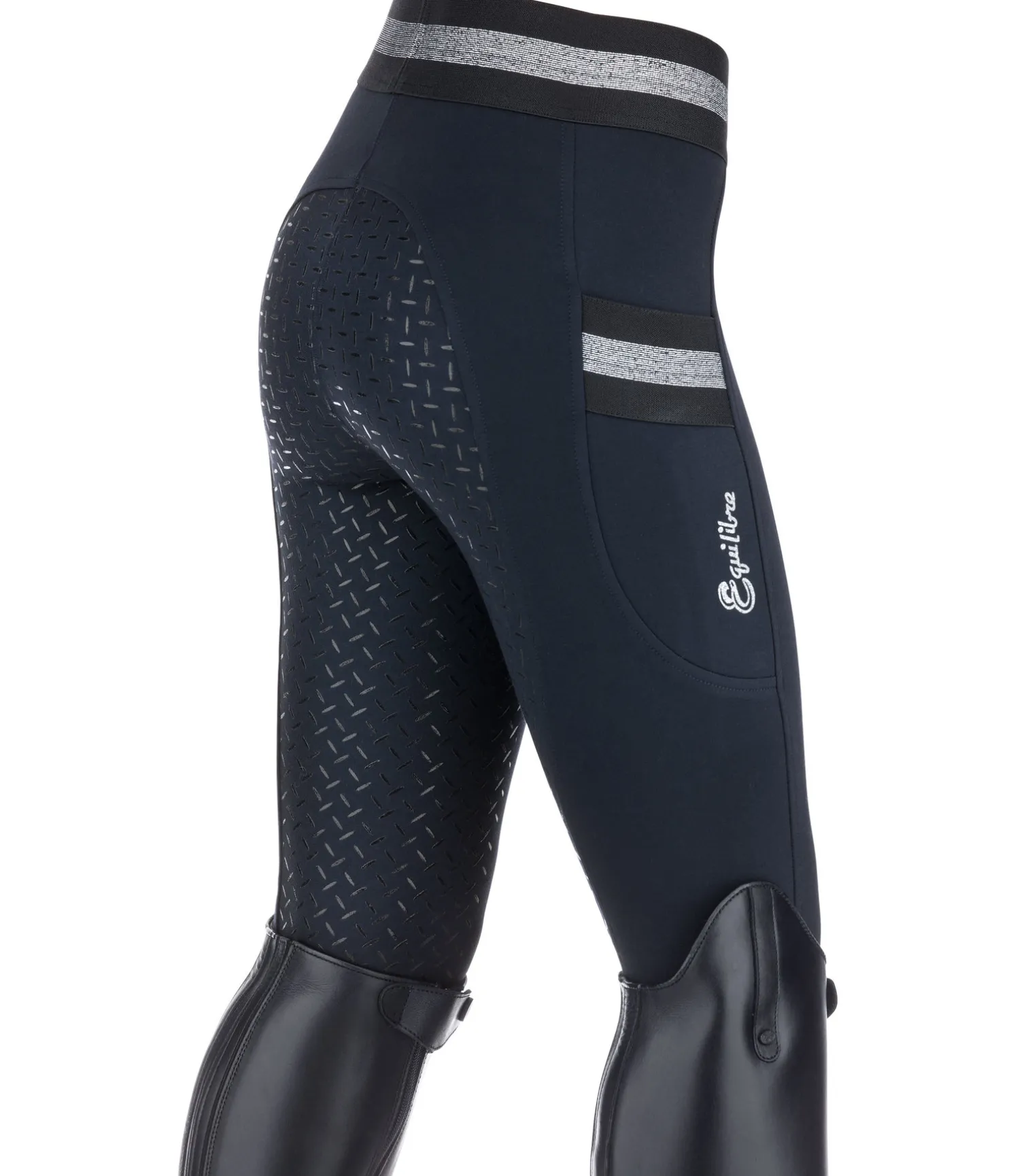 Legging d’équitation sportswear. Matière respirante et très confortable. Fond intégral en silicone. Matière stretch de grande qualité extensible dans 4 directions. Ceinture élastiquée pailletée. Poche pour téléphone portable sur la cuisse. Bas de jambe extensible sans patte auto-agrippante. 68 % viscose, 27 % polyamide, 5 % élasthanne.