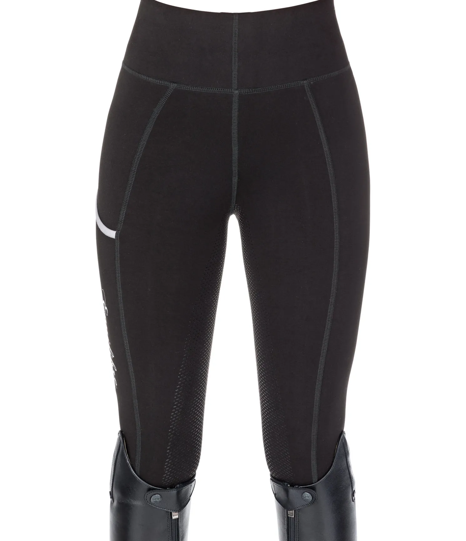 Legging d’équitation extrêmement confortable avec fond intégral grip en silicone. Stretch très doux et extensible dans 4 directions. Ceinture extra large. 1 poche zippée arrière et 1 poche pour téléphone portable sur la cuisse. Aucune couture au niveau des genoux. Bas de jambe extensible sans patte auto-agrippante. 68 % viscose, 27 % nylon, 5 % élasthanne.