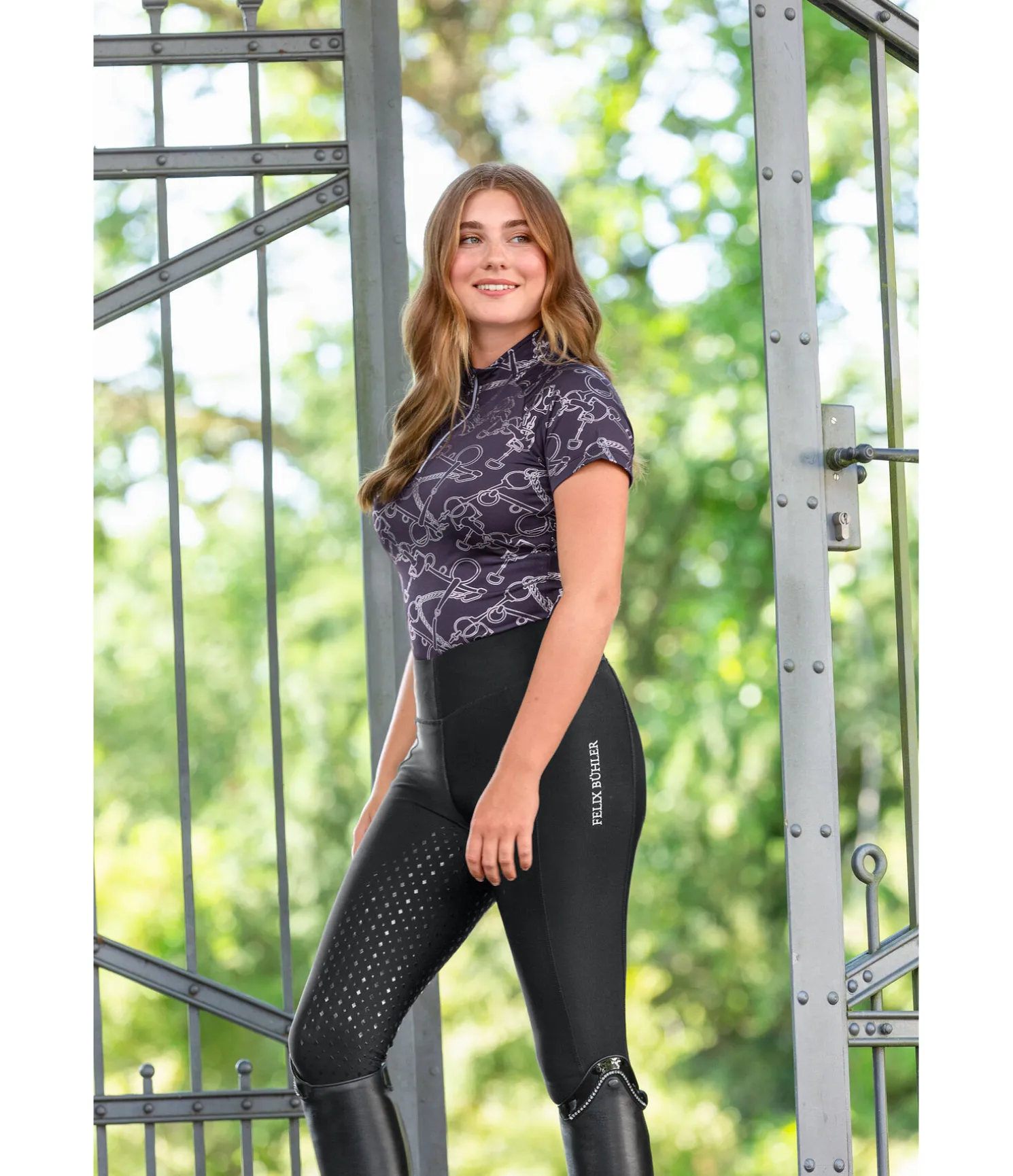 Legging d’équitation confortable. Fond intégral grip en silicone. Matière stretch extensible dans 4 directions. Ceinture extra large. Poche zippée arrière et poche latérale pour téléphone portable. Aucune couture au niveau des genoux. Bas de jambe extensible. Imprimé siliconé Felix Bühler. 90 % nylon, 10 % élasthanne.