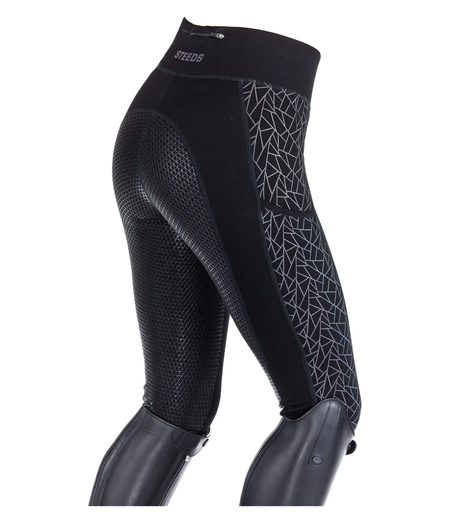 Legging d’équitation taille haute. Fond intégral grip. En matière élastique confortable et respirante. Imprimé géométrique holographique réfléchissant aux couleurs de l’arc-en-ciel à l’extérieur de la jambe. Poche latérale pour le téléphone portable sur la cuisse. Petite poche zippée à l’arrière du pantalon. Ceinture large pour un confort optimal. 68 % viscose, 28 % nylon, 4 % élasthanne.