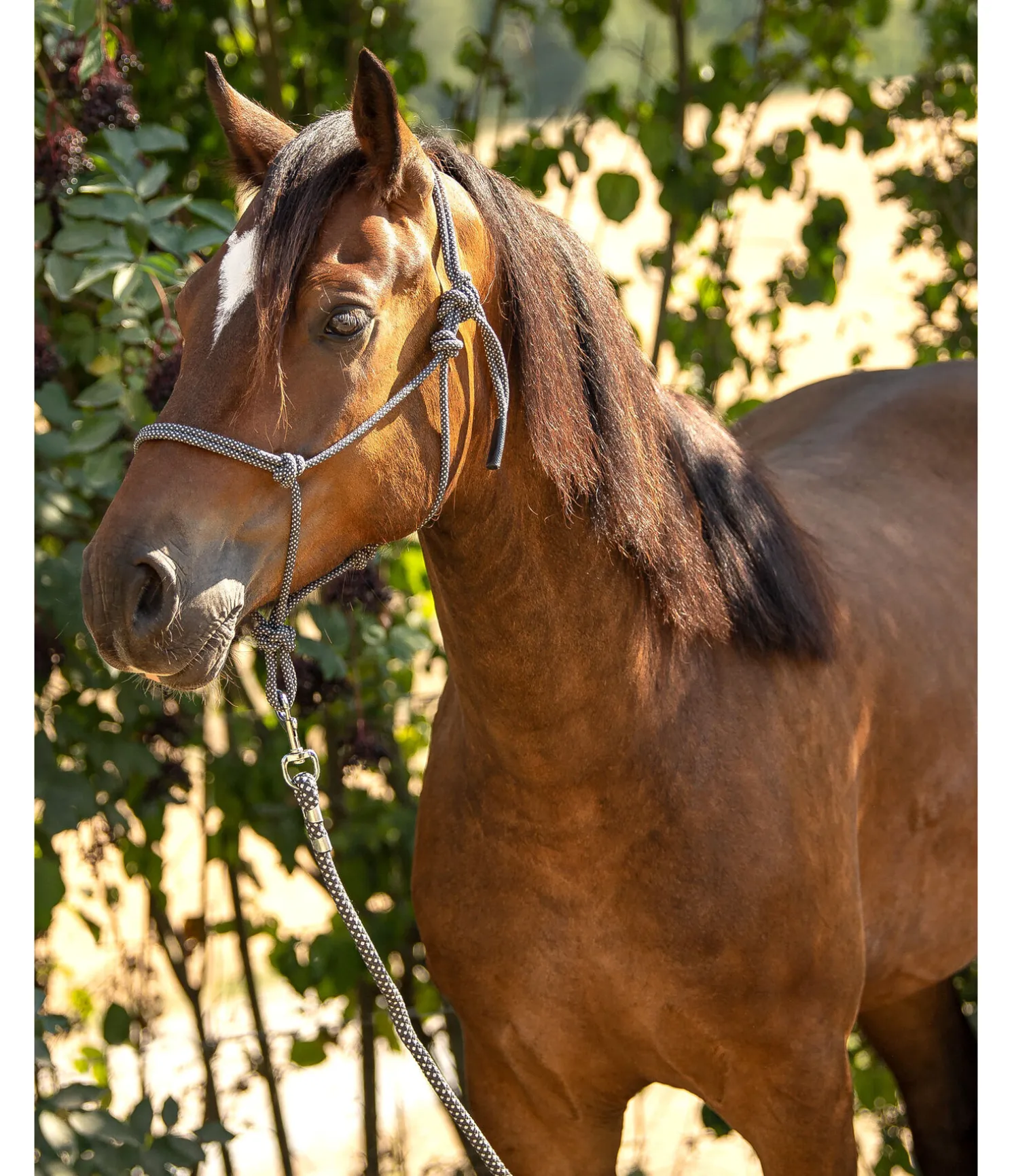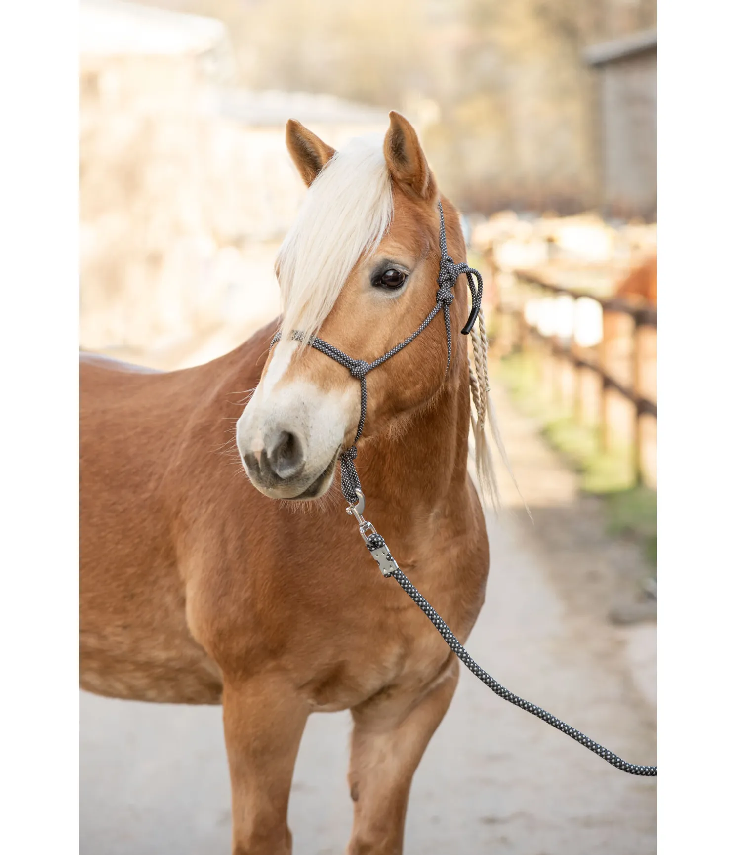 Ensemble composé d’un licol à noeuds et d’une longe avec mousqueton Bolt Snap. Convient pour le travail au sol. Longueur : 2,50 m.