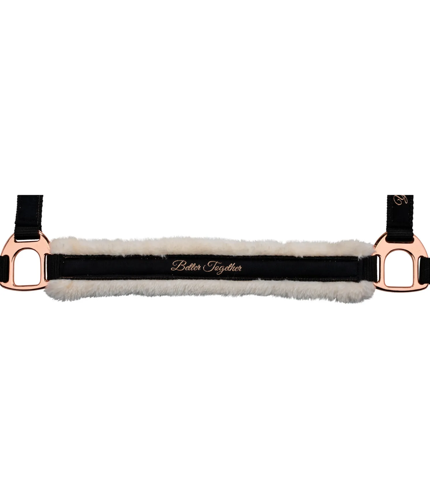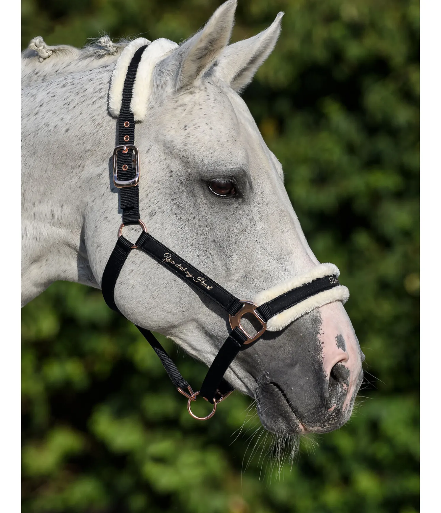 Licol original avec rembourrage en polaire Teddy douce à la têtière et à la muserolle. Broderies en fil scintillant : « Better Together » sur la muserolle et « You are my Heaven on Earth » sur les montants. Têtière doublement réglable et muserolle facile à régler. Avec mousqueton. Broderies et bouclerie argentées pour les couleurs AN et DQ, rose doré pour les couleurs SR, MR et FZ, et dorées en MA. Licol 100 % polypropylène, polaire Teddy 100 % polyester.