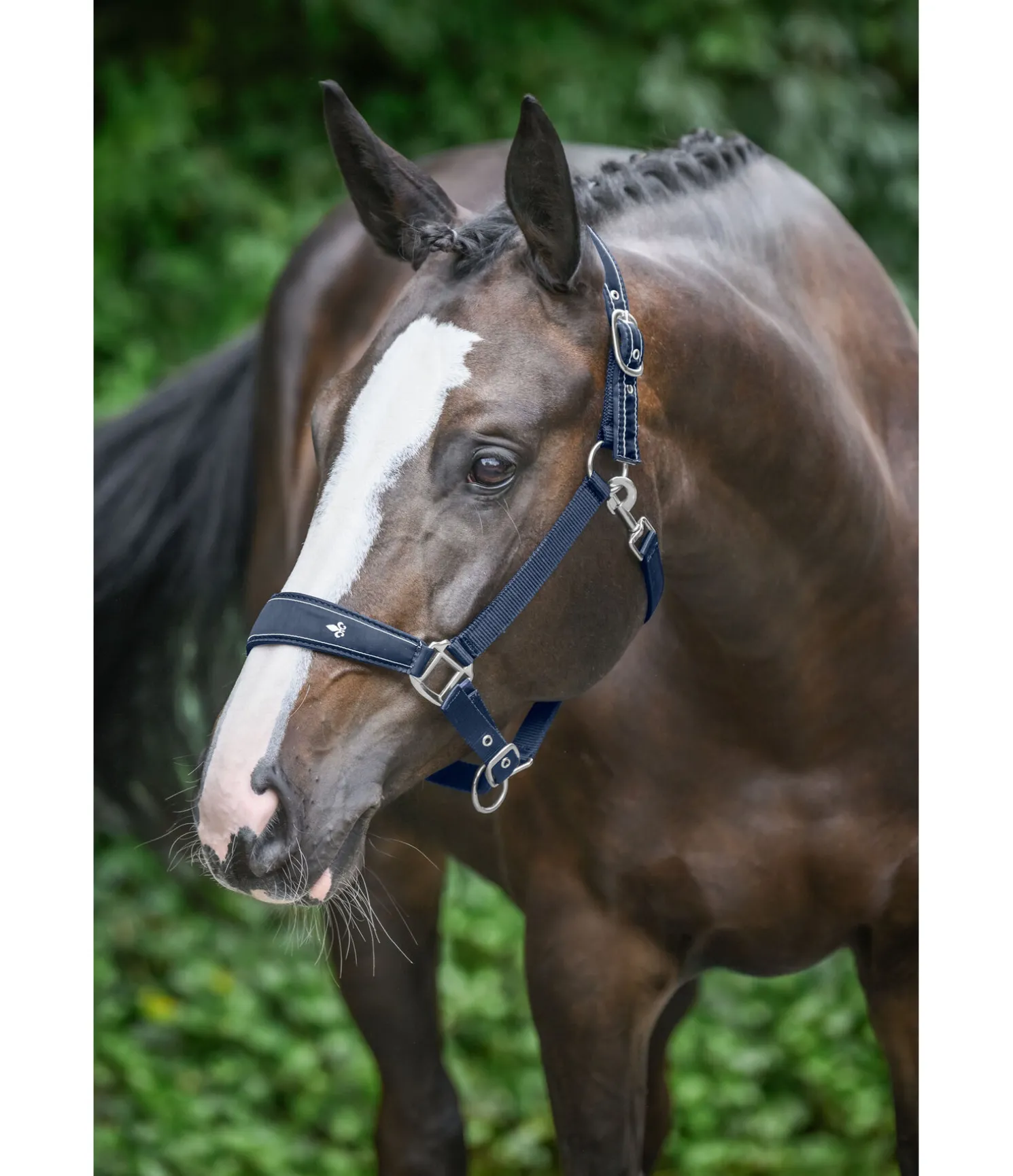 Licol sportif avec têtière et muserolle doublées de caoutchouc chloroprène doux. Lys blancs sur la muserolle. Têtière et muserolle réglables. Bouclerie argentée. Licol 100 % polypropylène.
