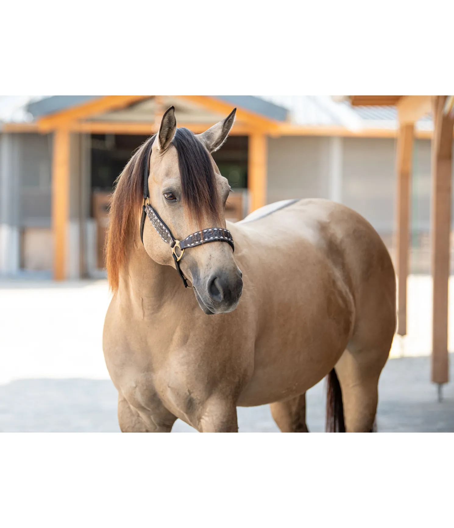 Licol chic en nylon et cuir véritable avec doublure douce. Avec gravure florale et détails en cuir brut. Têtière réglable. Bouclerie de haute qualité en couleur laiton.