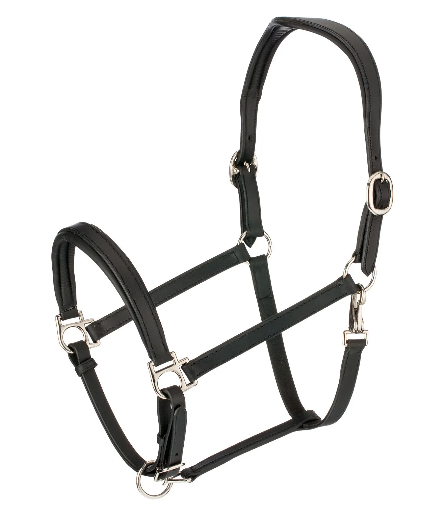 Licol de forme anatomique en cuir gras avec doublure douce en cuir à la têtière et la muserolle. Gaufrage logo discret sur la têtière. Têtière et muserolle réglables. Bouclerie argentée.