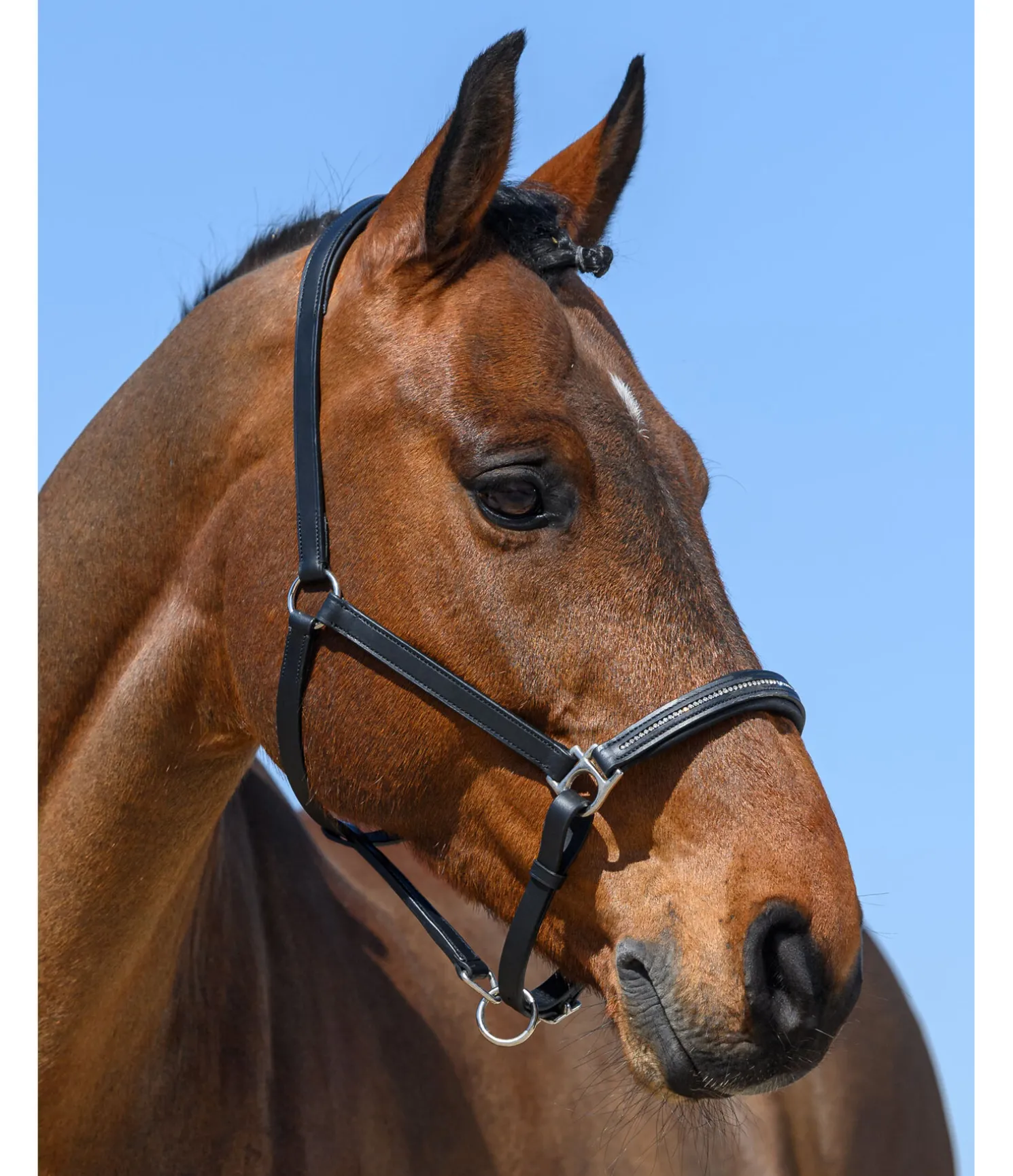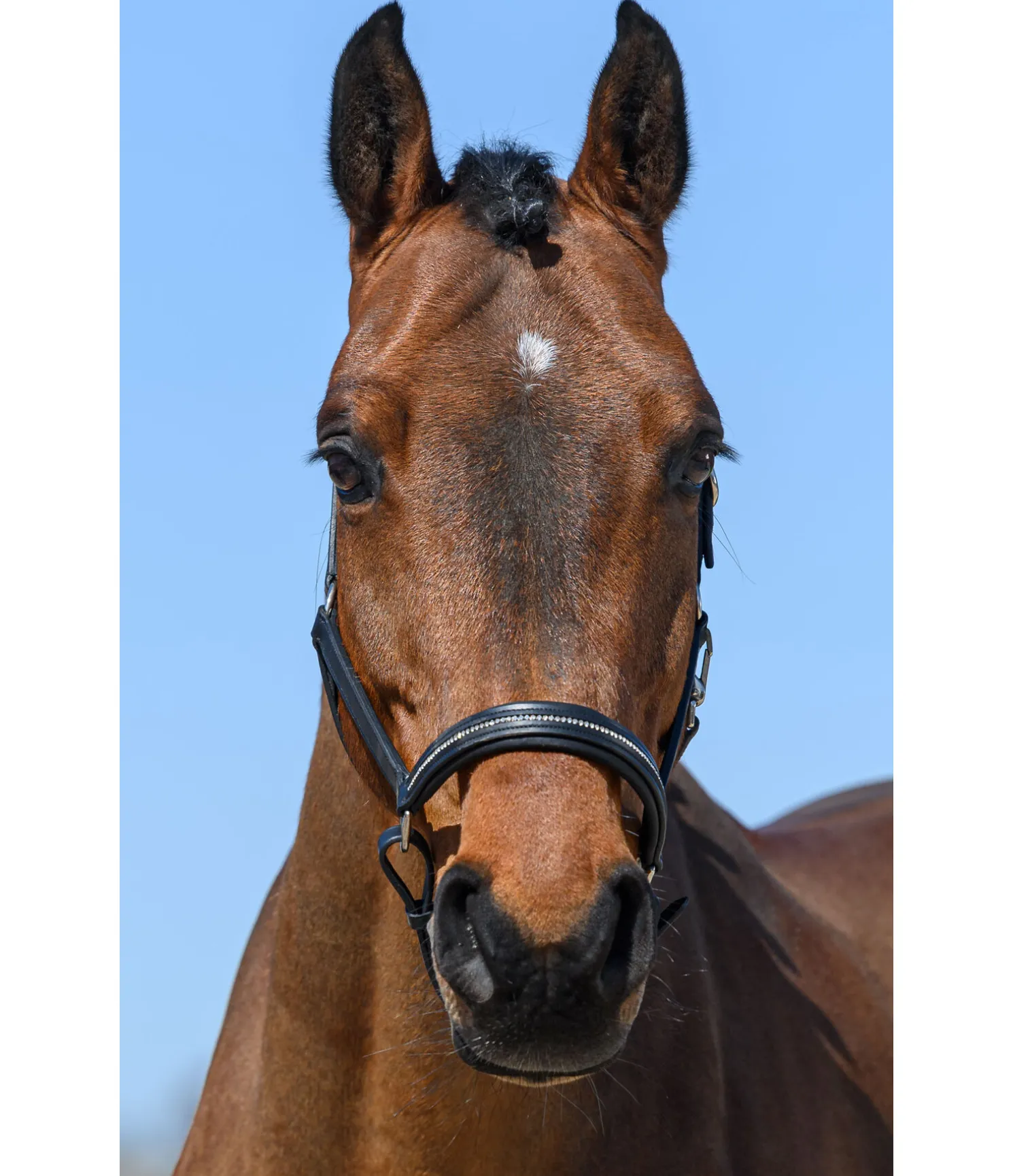 Licol en cuir gras orné d’une rangée de petits strass blancs discrets sur la muserolle. Doublure moelleuse en cuir véritable à la muserolle et la têtière pour un confort optimal. Têtière et muserolle facilement réglables. Bouclerie argentée.