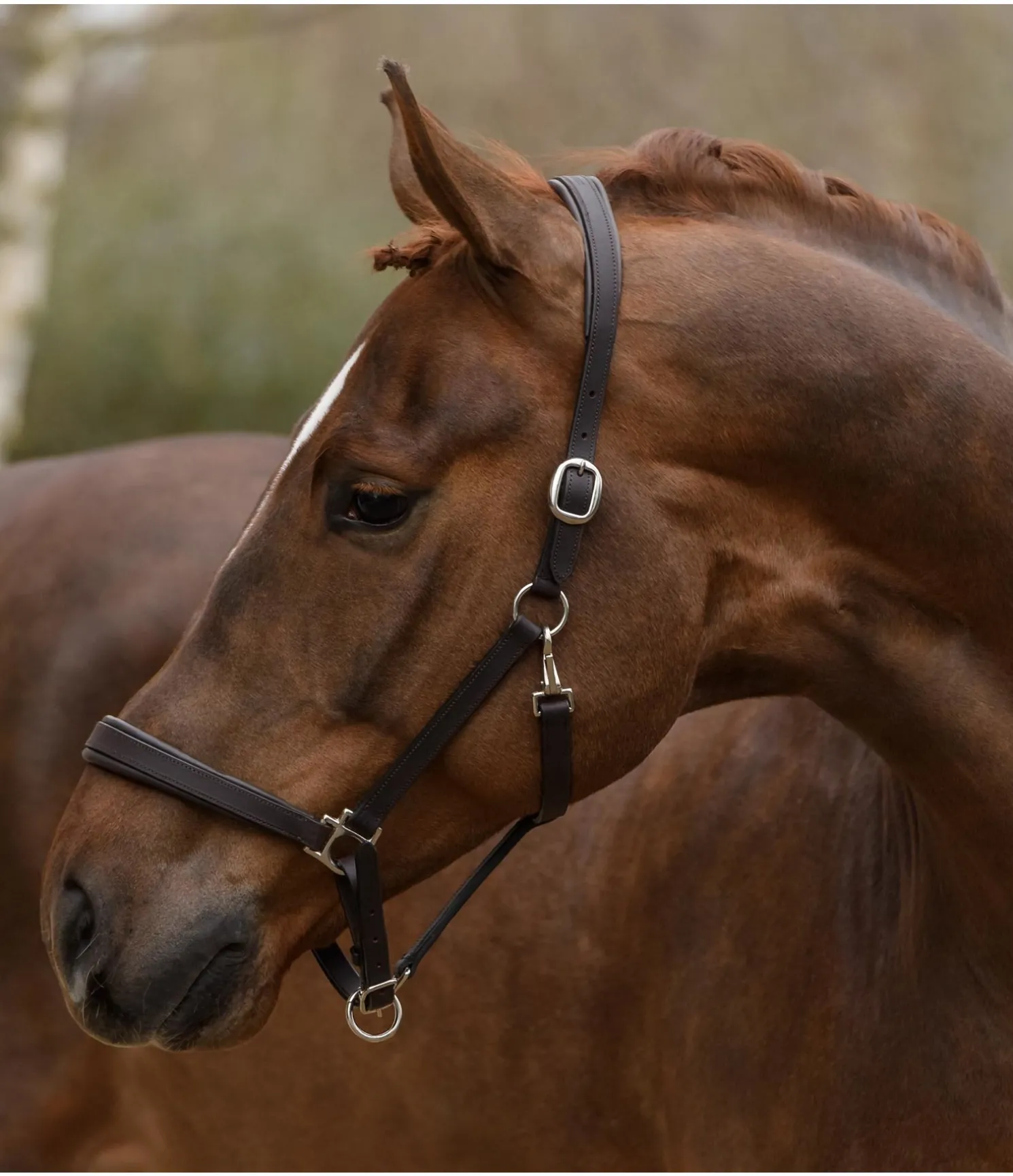 Licol en cuir gras classique de coupe simple avec doublure en cuir moelleux à la têtière et à la muserolle. Logo discret embossé sur la têtière. Têtière et muserolle facilement réglables. Bouclerie argentée.
