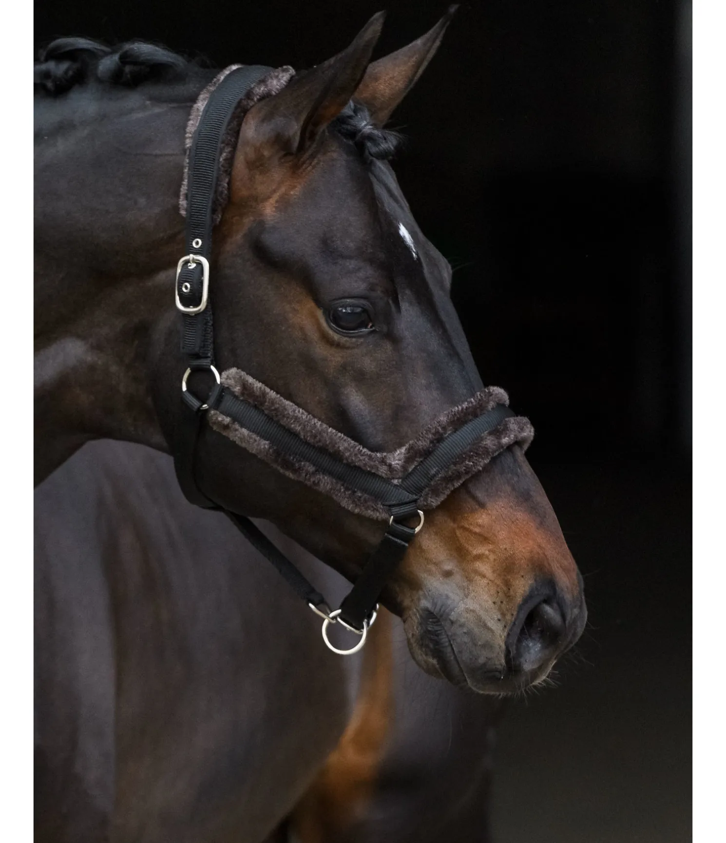 Licol particulièrement confortable avec large têtière anatomique et découpe aux oreilles. La coupe innovante en une seule partie recourbée constituant les montants et la muserolle permet d’éviter les pressions sur les nerfs faciaux et de ne pas avoir de grosses pièces métalliques sur les côtés de la muserolle. Têtière, montants et muserolle avec doublure en polaire Teddy douce. Têtière doublement réglable et muserolle réglable. Bouclerie argentée. Licol 100 % polypropylène, polaire Teddy 100 % polyester.