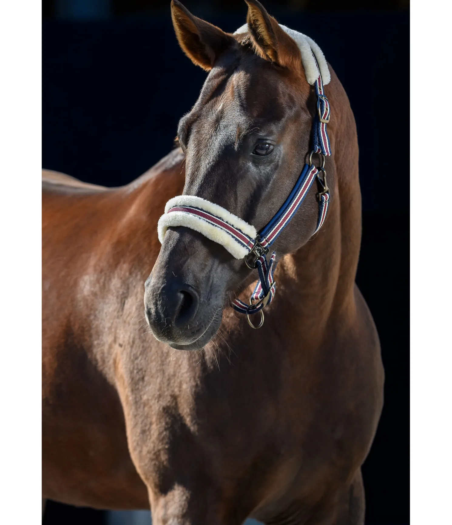 Licol sportswear avec doublure en polaire Teddy douce sur la têtière et muserolle et en caoutchouc-chloroprène moelleux sur les montants. Design tricolore tendance. Têtière doublement réglable et muserolle réglable. Bouclerie en métal de couleur assortie. Licol 100 % polypropylène, polaire Teddy 100 % polyester.