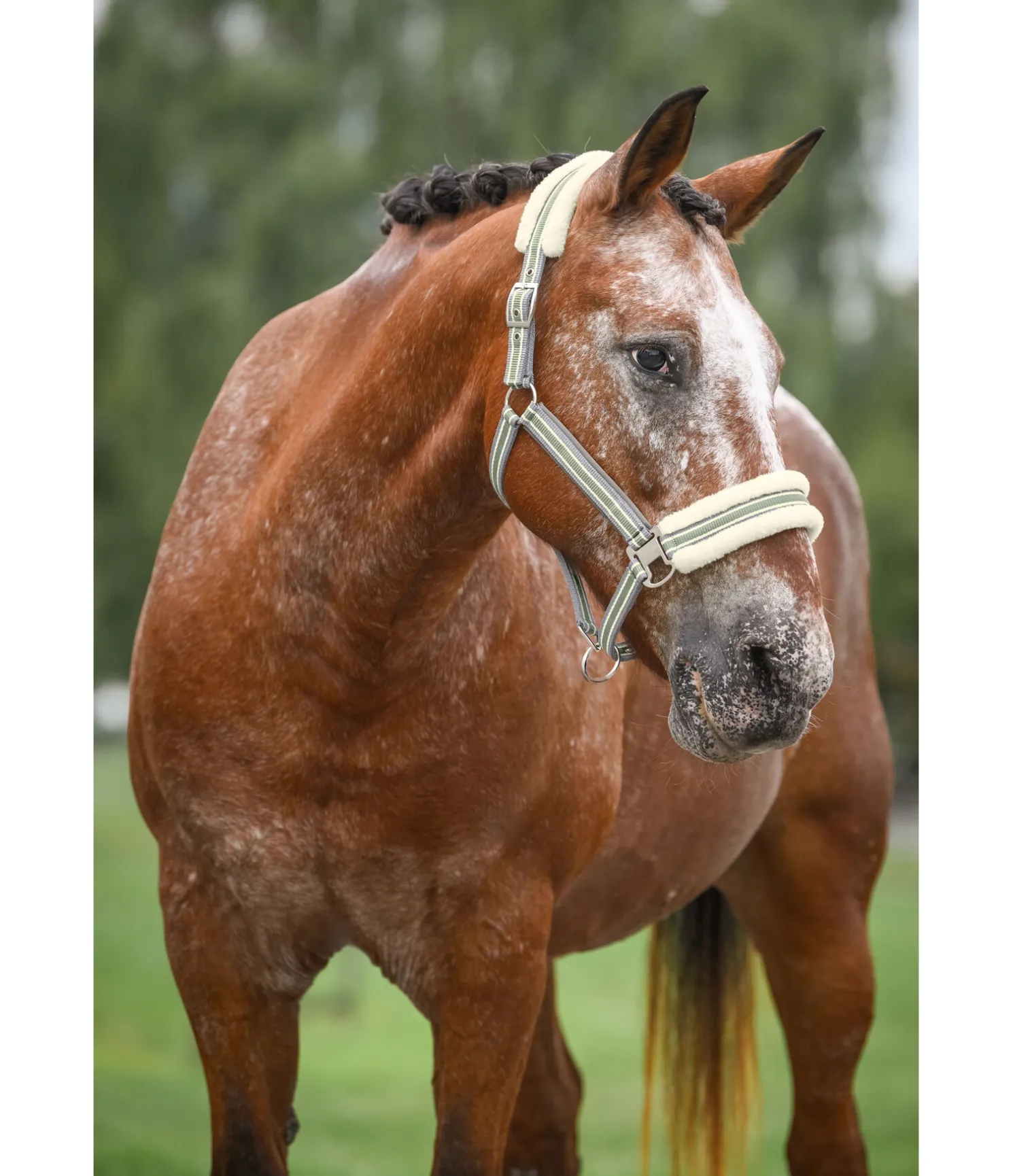 Licol sportswear avec doublure en polaire Teddy douce sur la têtière et muserolle et en caoutchouc-chloroprène moelleux sur les montants. Design tricolore tendance. Têtière doublement réglable et muserolle réglable. Bouclerie en métal de couleur assortie. Licol 100 % polypropylène, polaire Teddy 100 % polyester.