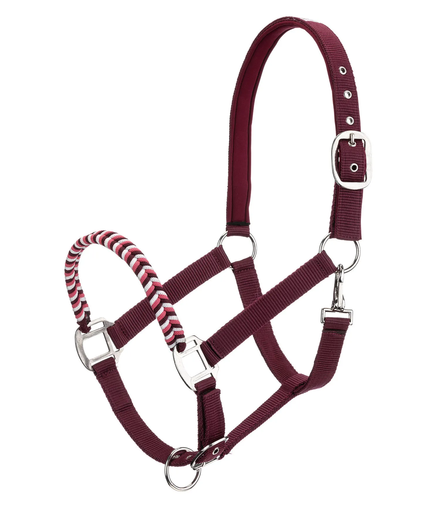 Licol exceptionnel avec muserolle tressée dans un look tricolore et broderie logo sur la têtière. Muserolle et têtière réglables. Têtière avec doublure moelleuse en caoutchouc chloroprène.