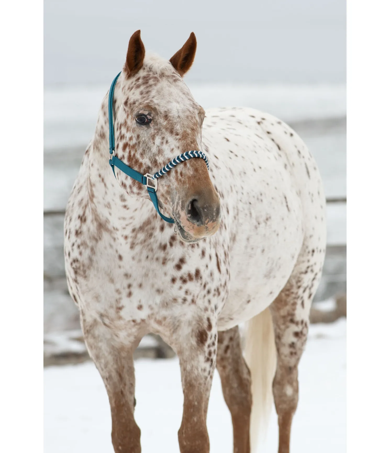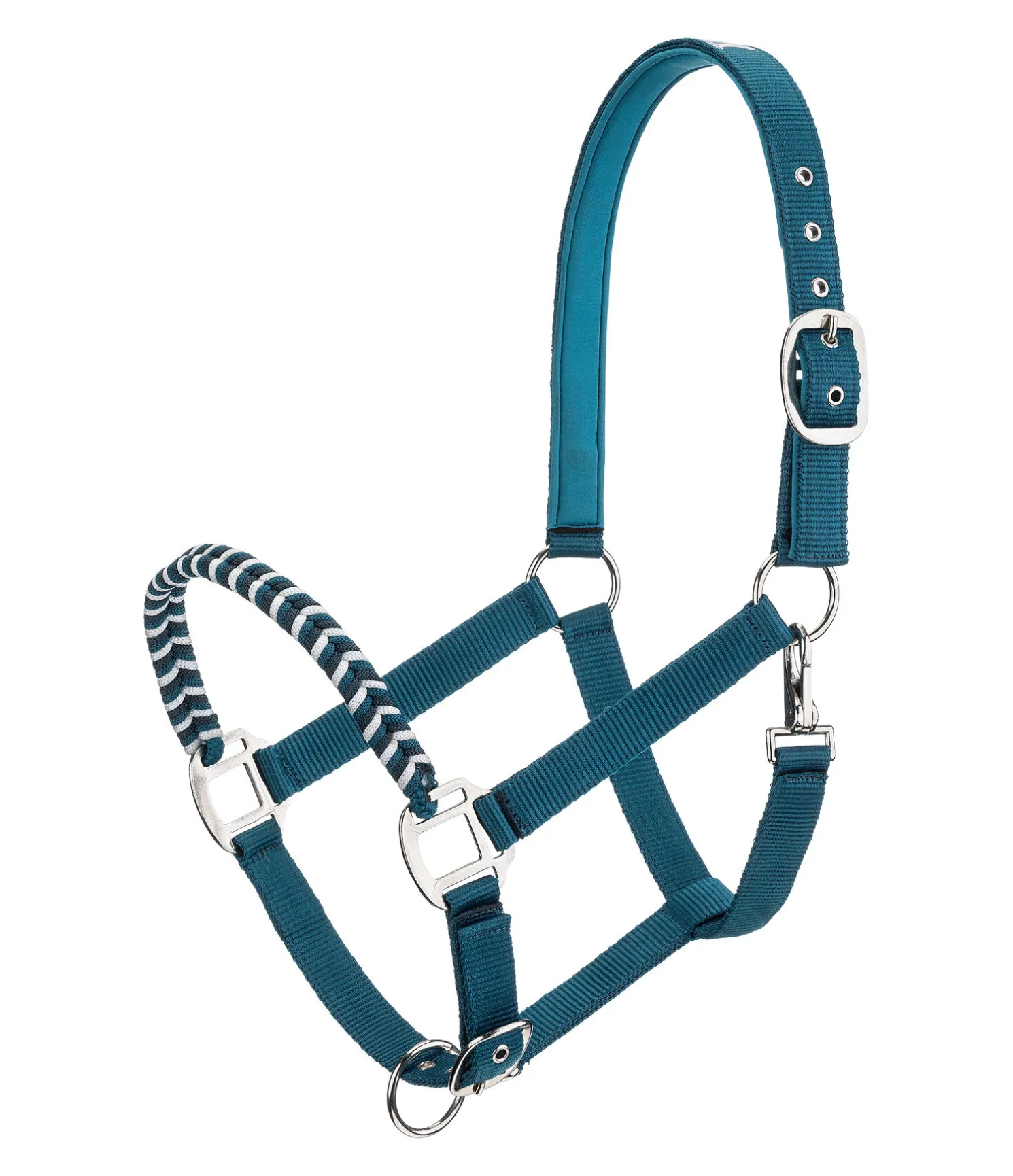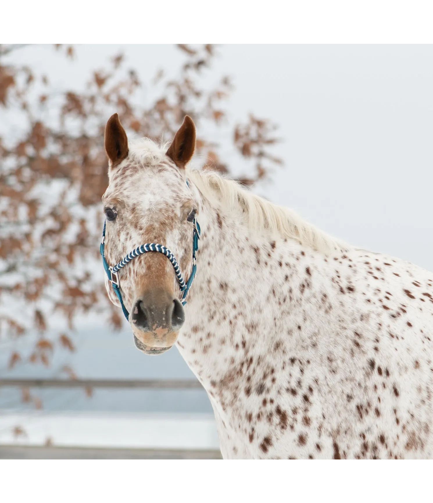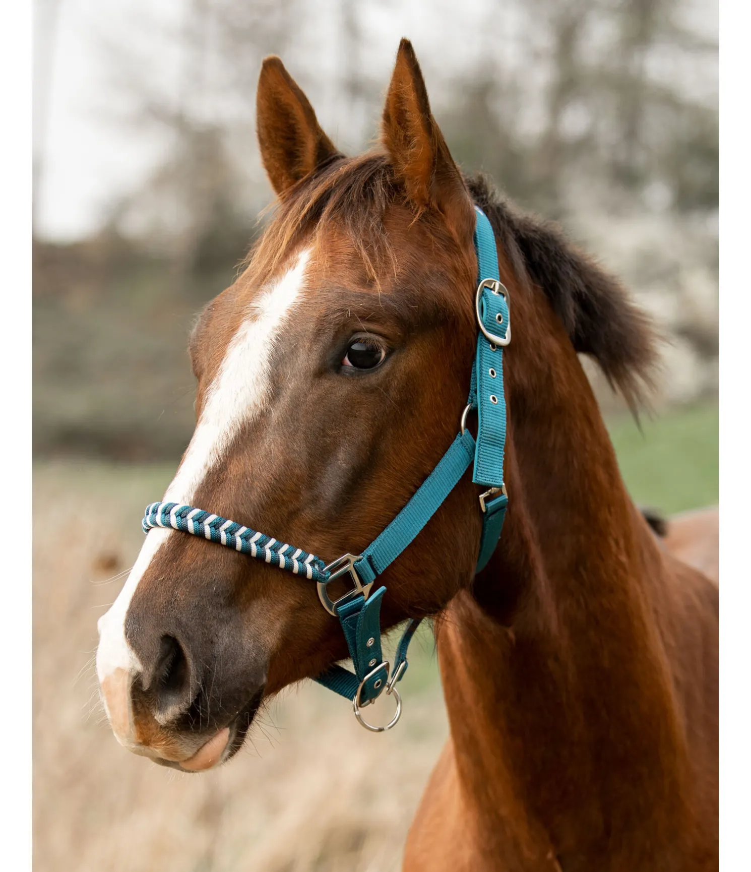 Licol exceptionnel avec muserolle tressée dans un look tricolore et broderie logo sur la têtière. Muserolle et têtière réglables. Têtière avec doublure moelleuse en caoutchouc chloroprène.