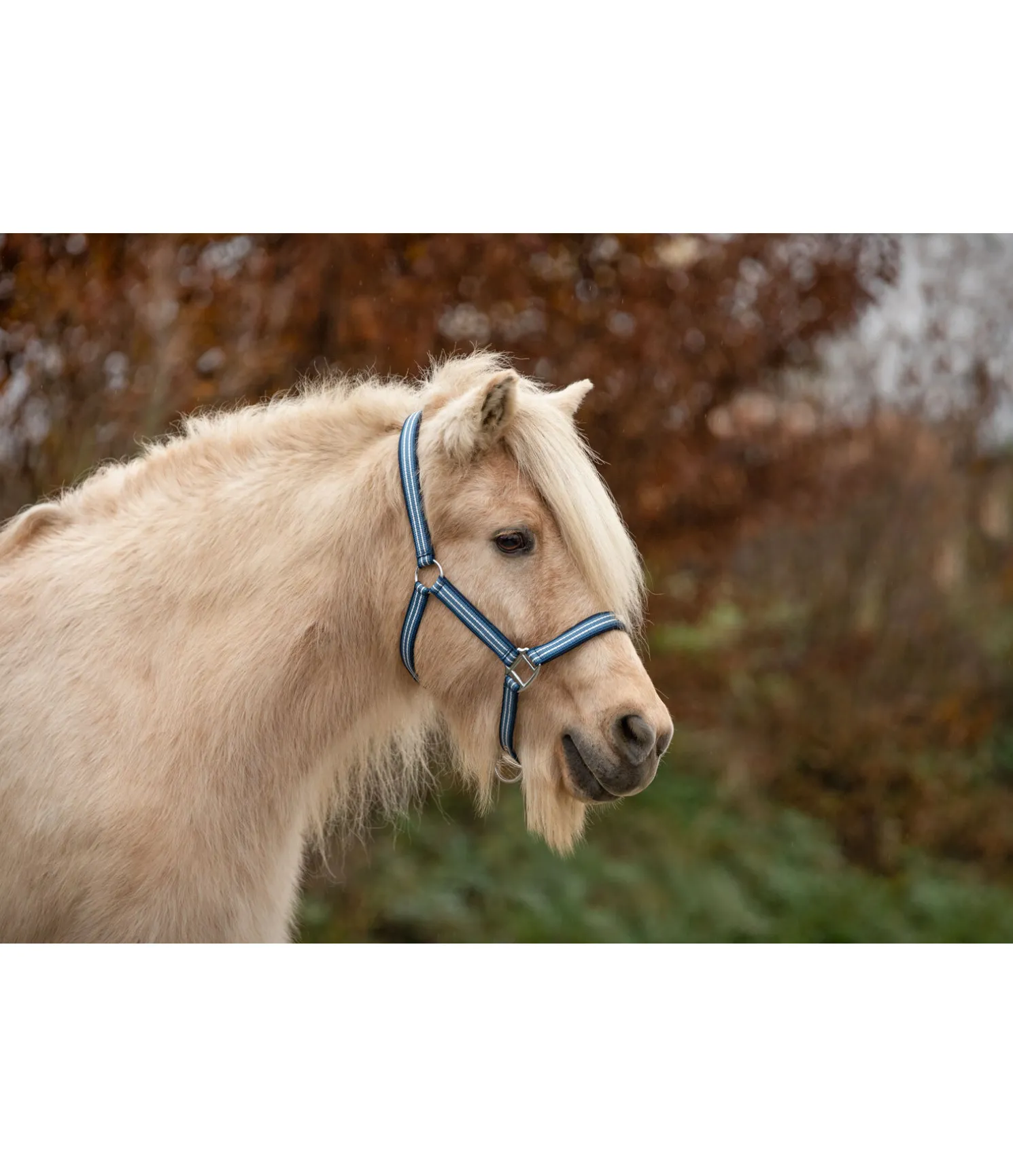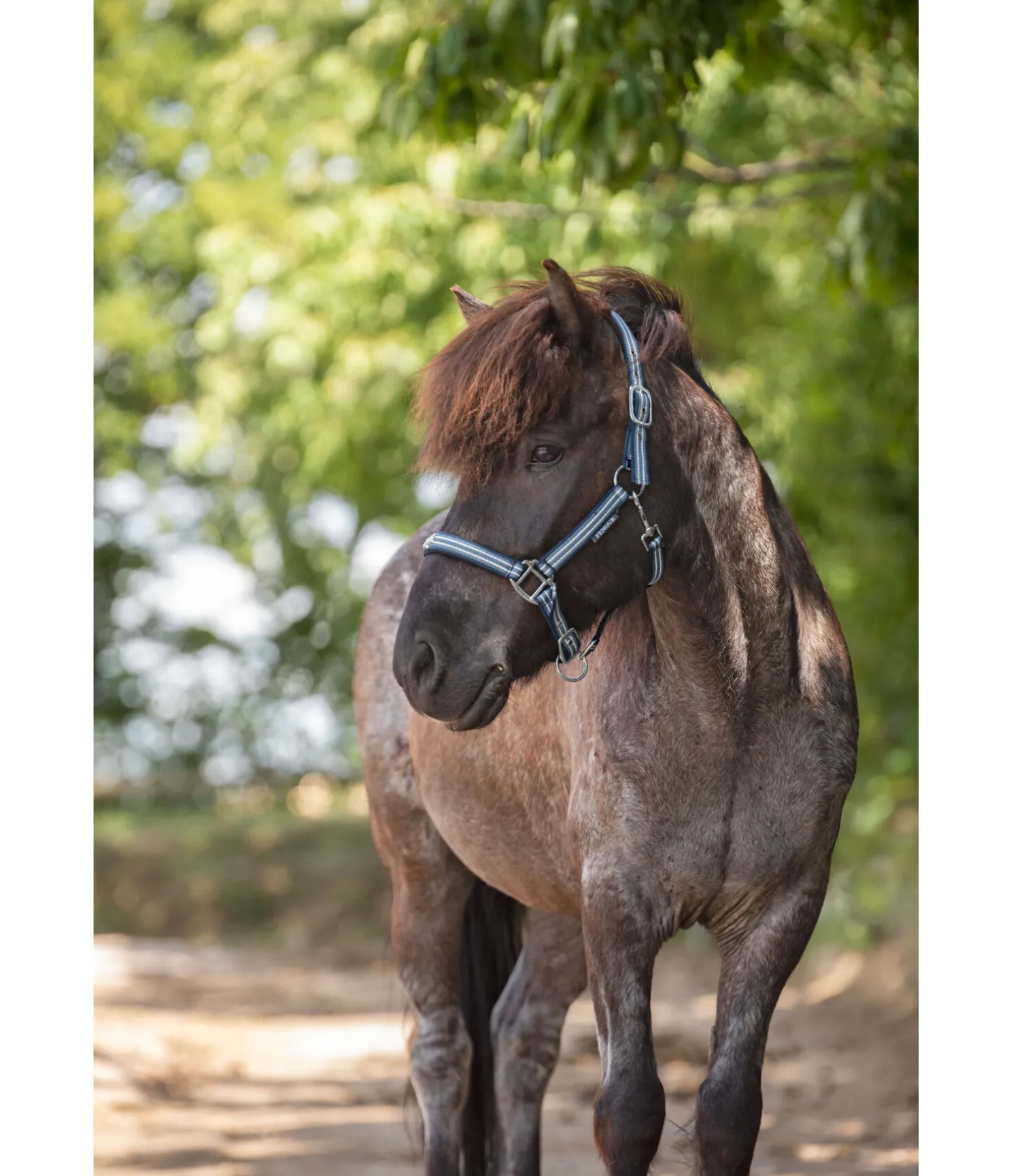 Licol au look sportif. Médaillon argenté en forme de cheval islandais sur la muserolle. Doublure moelleuse. Têtière et muserolle réglables.