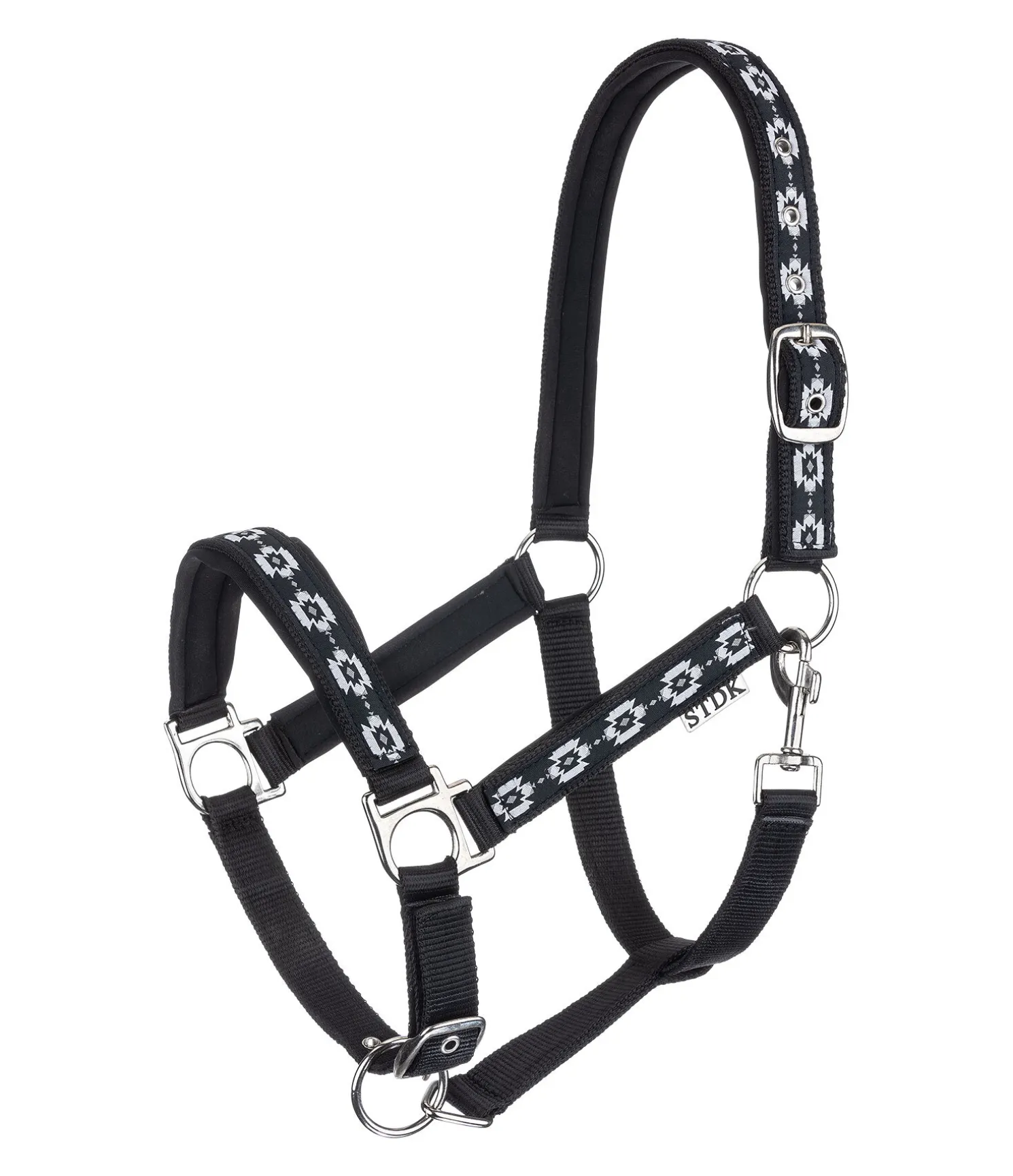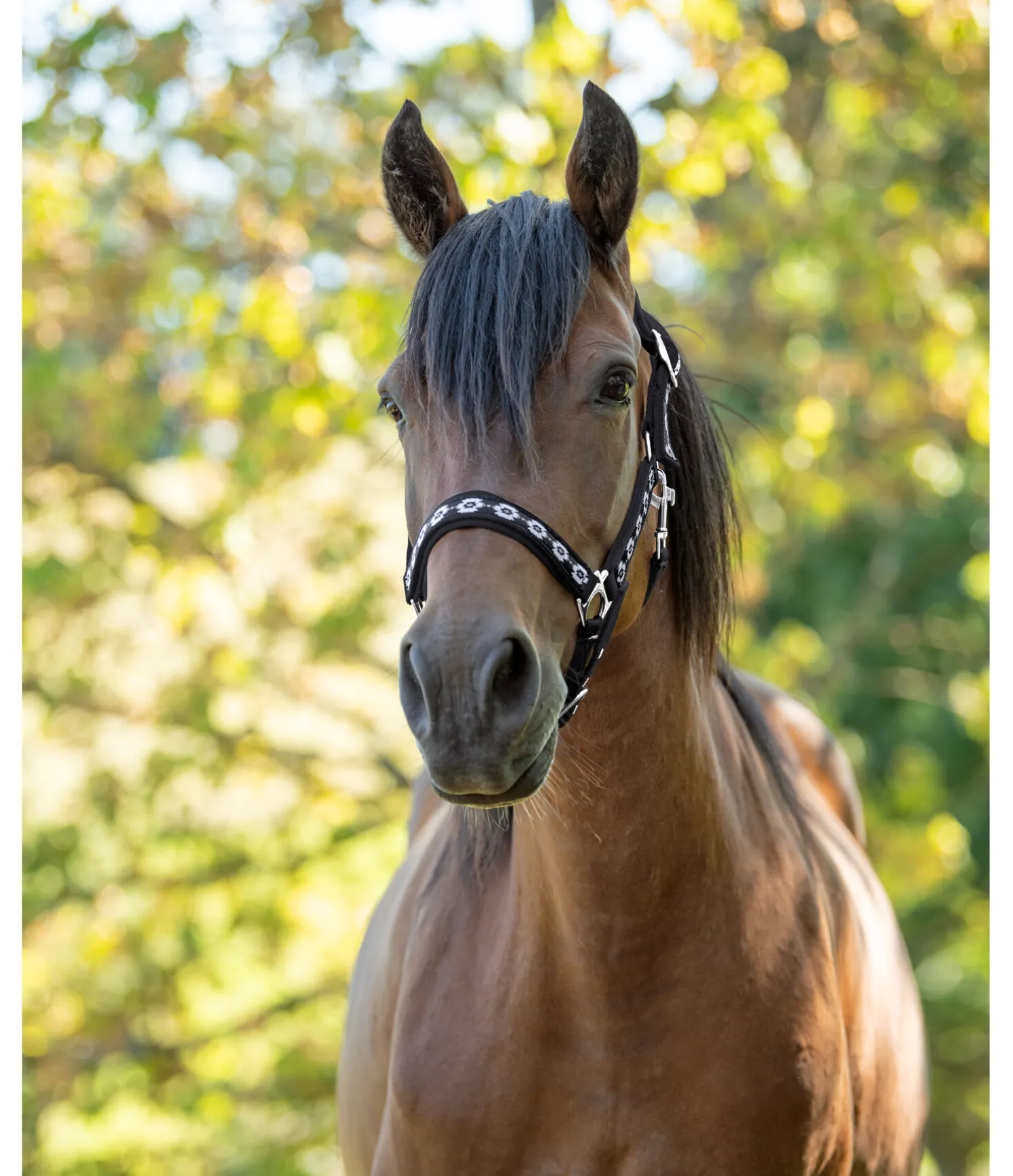 Licol avec motif imprimé. La muserolle, les montants et la têtière sont doublés de caoutchouc chloroprène souple. Réglable au niveau de la têtière et de la muserolle. Licol 100 % polypropylène, rembourrage 100 % caoutchouc chloroprène.