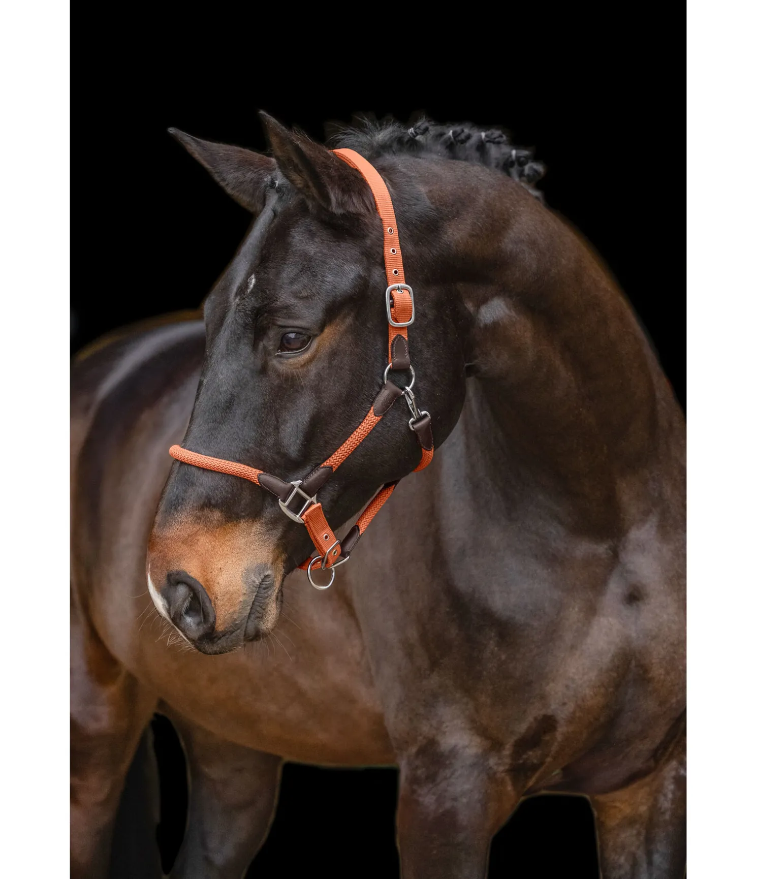 Licol exceptionnel avec corde tressée et extrêmités en cuir, qui lui confèrent un look particulièrement soigné. Assorti à la longe Kate (440 543 et 440 686). Muserolle et têtière réglables. Bouclerie argentée. Licol 100 % polypropylène, doublure 100 % caoutchouc chloroprène.