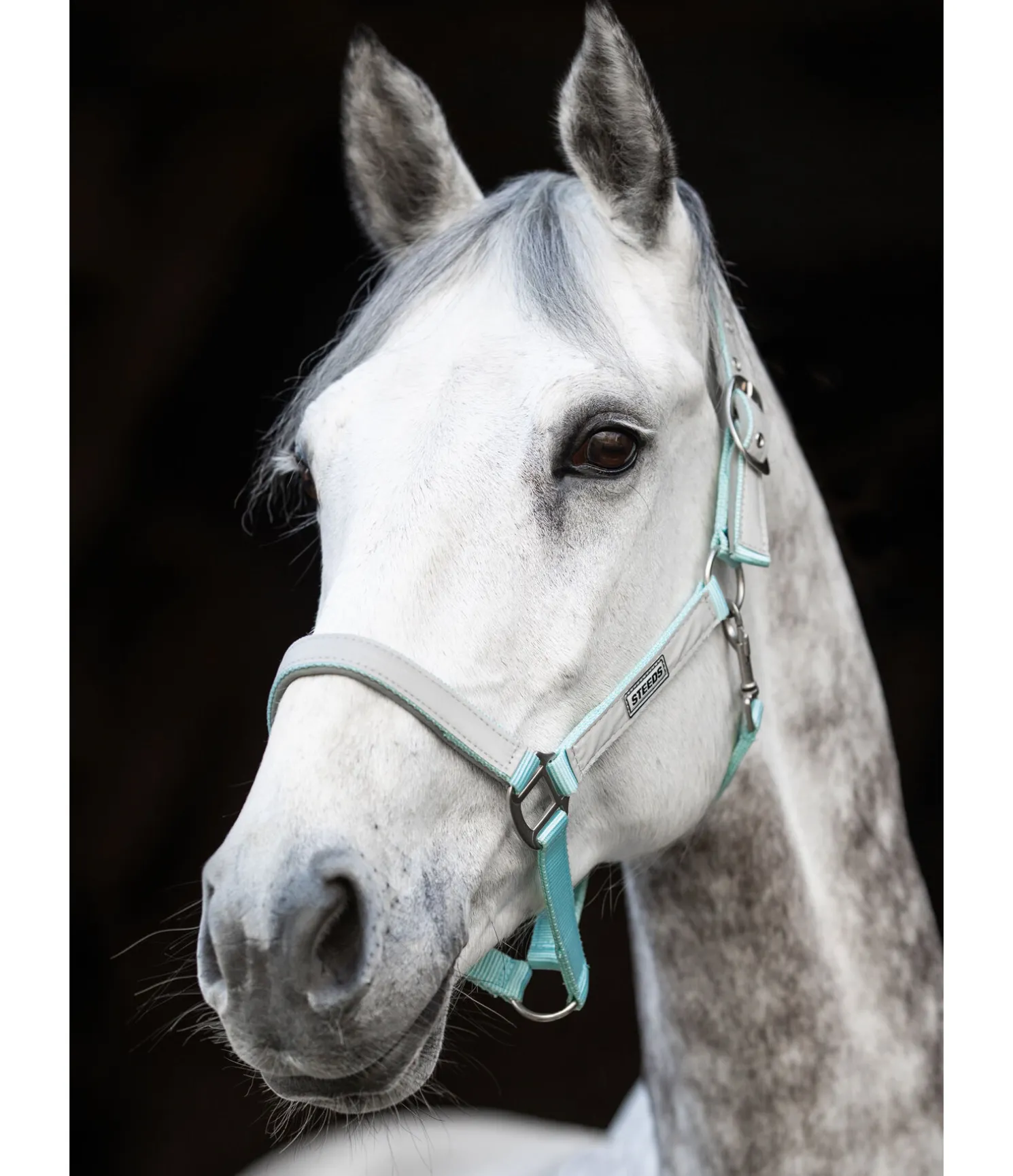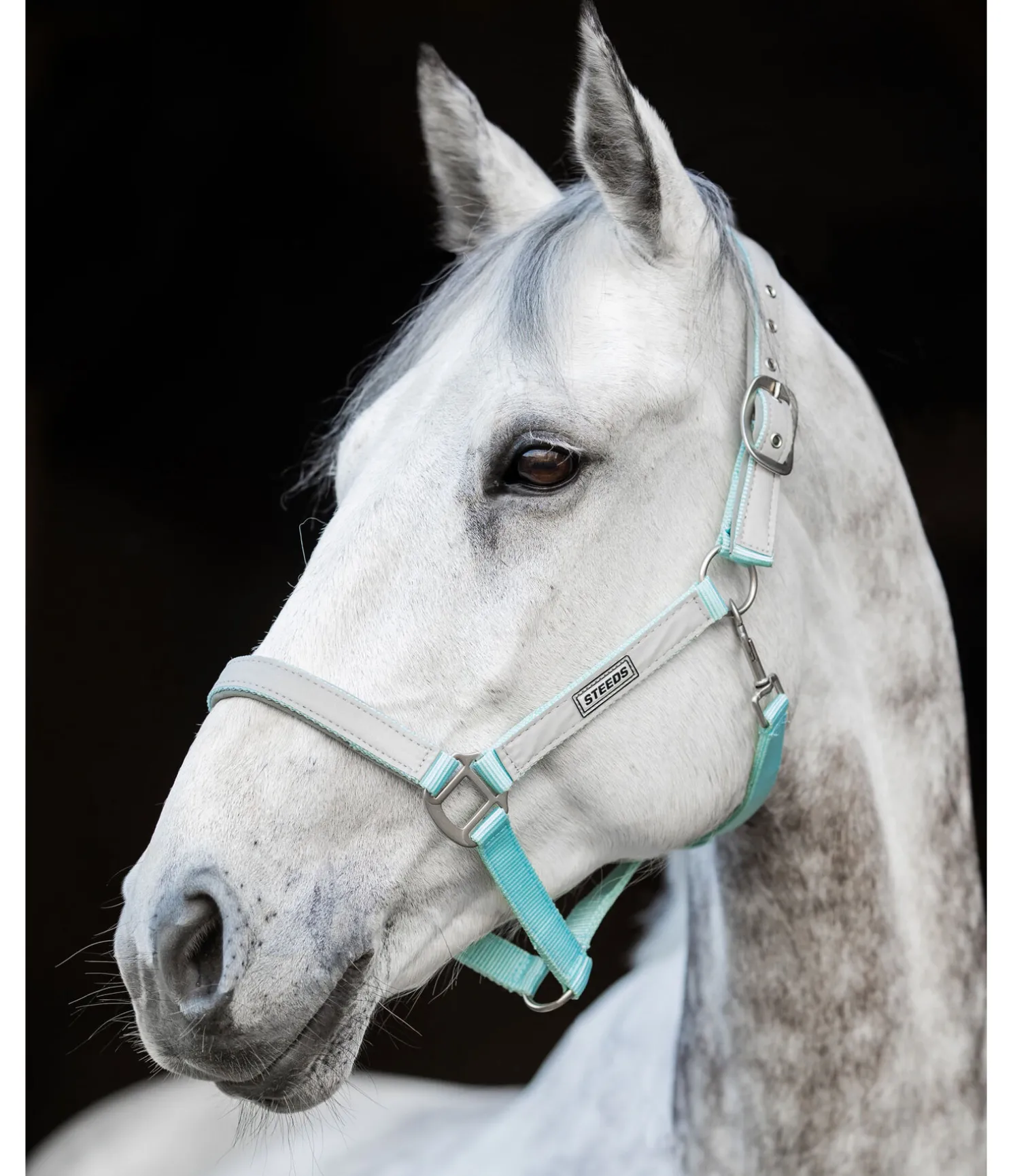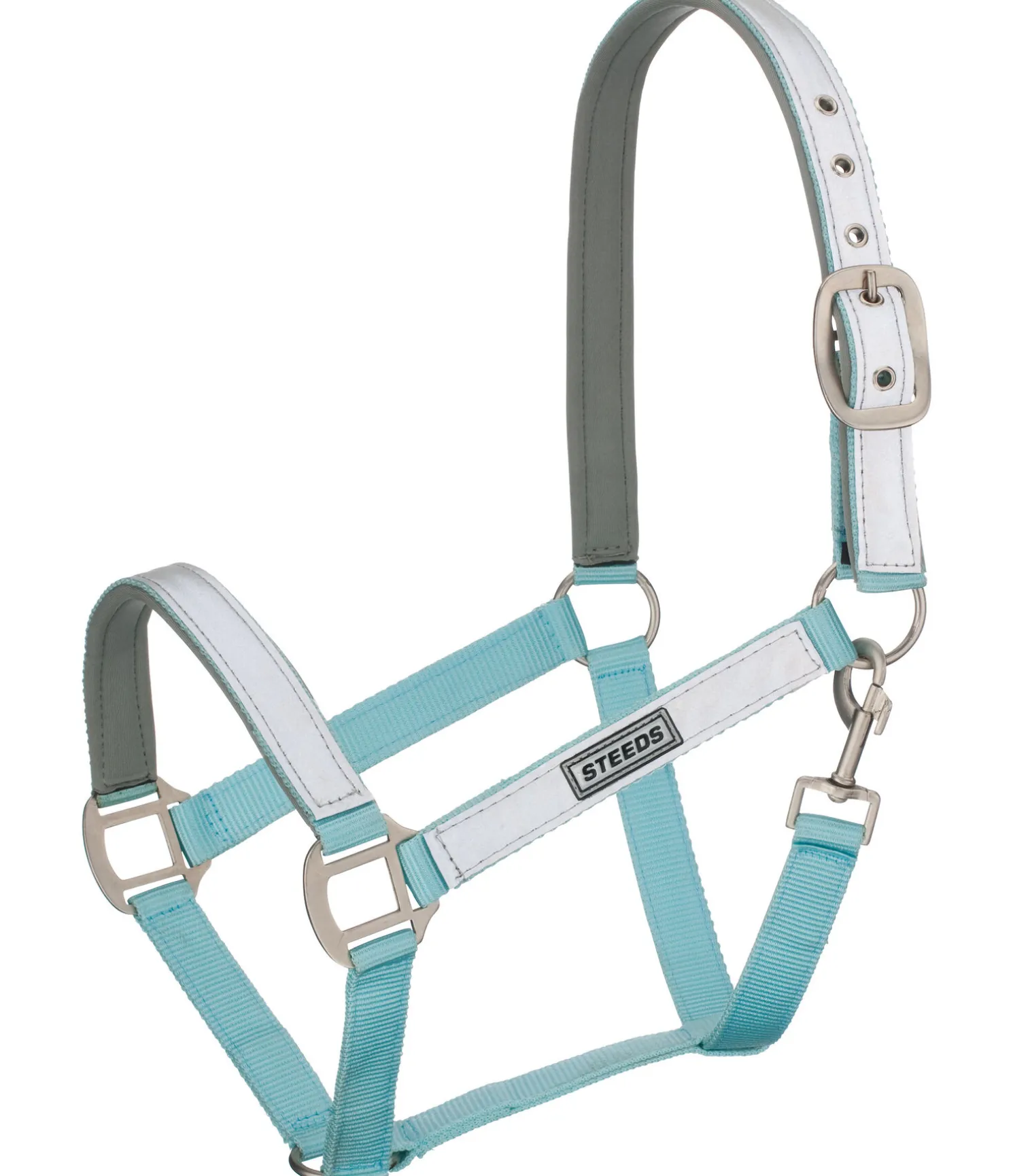Licol en nylon avec doublure moelleuse et bandes réfléchissantes. Réglable à la têtière. Bouclerie argentée mat.