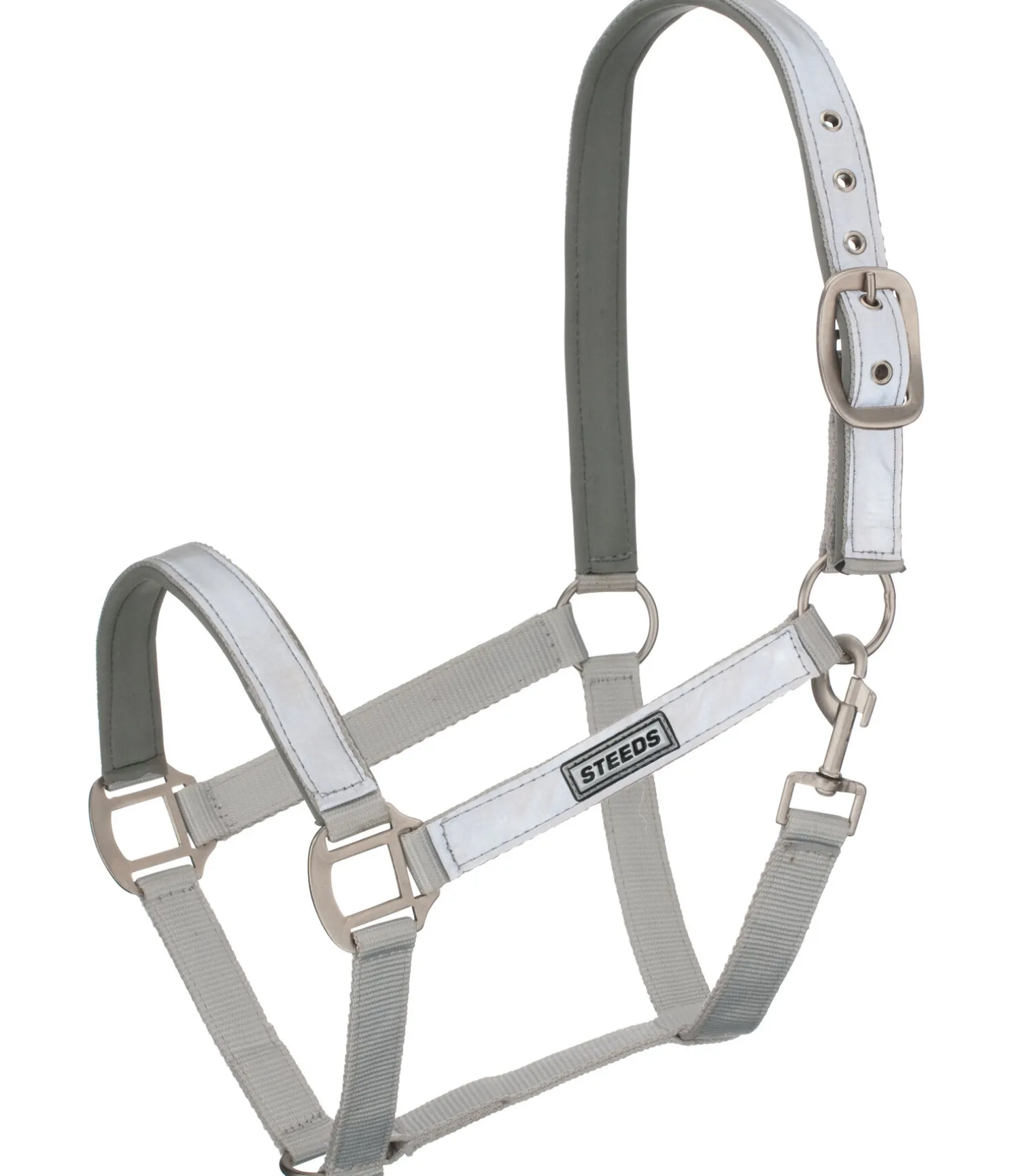 Licol en nylon avec doublure moelleuse et bandes réfléchissantes. Réglable à la têtière. Bouclerie argentée mat.