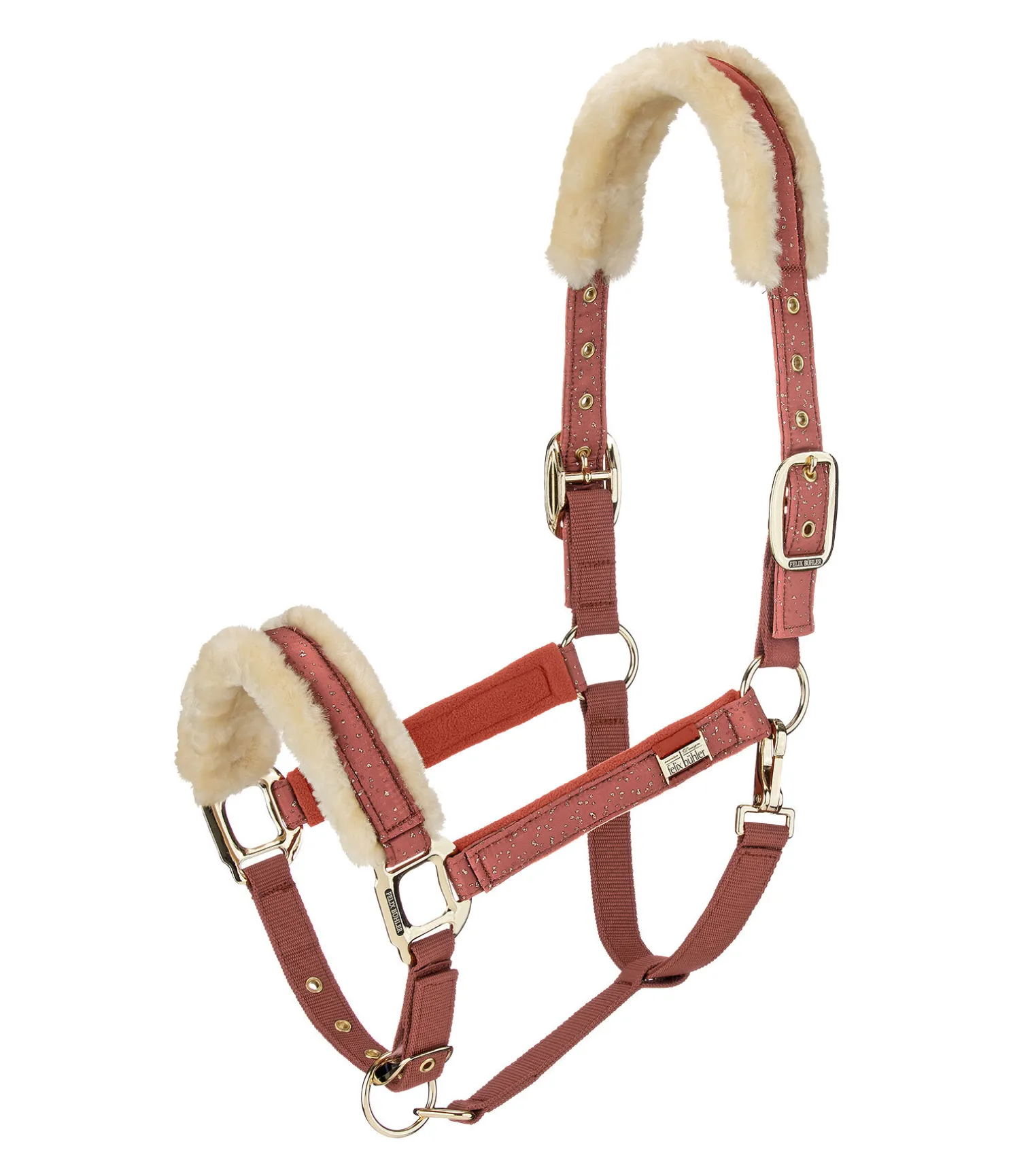 Magnifique licol avec revêtement satiné orné de fragments scintillants et bouclerie de couleur assortie. Têtière et muserolle avec doublure douce en polaire Teddy. Petite plaque élégante avec logo gravé sur chaque montant. Têtière doublement réglable et muserolle réglable. Licol 100 % polypropylène, doublure et revêtement 100 % polyester.