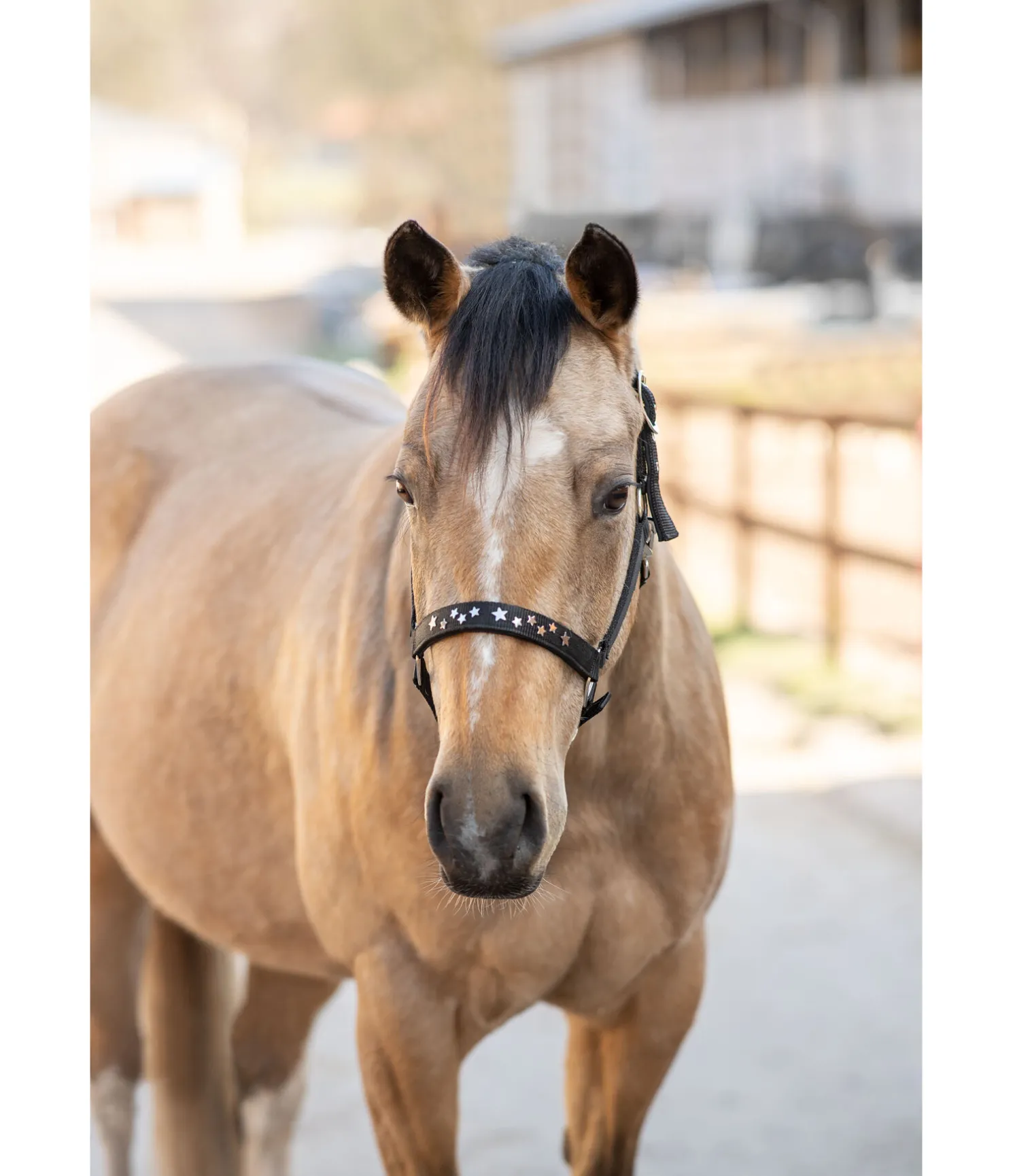 Licol orné de petites étoiles en métal sur la muserolle. Doublure douce en caoutchouc chloroprène sur la têtière et la muserolle. Têtière et muserolle réglables.
