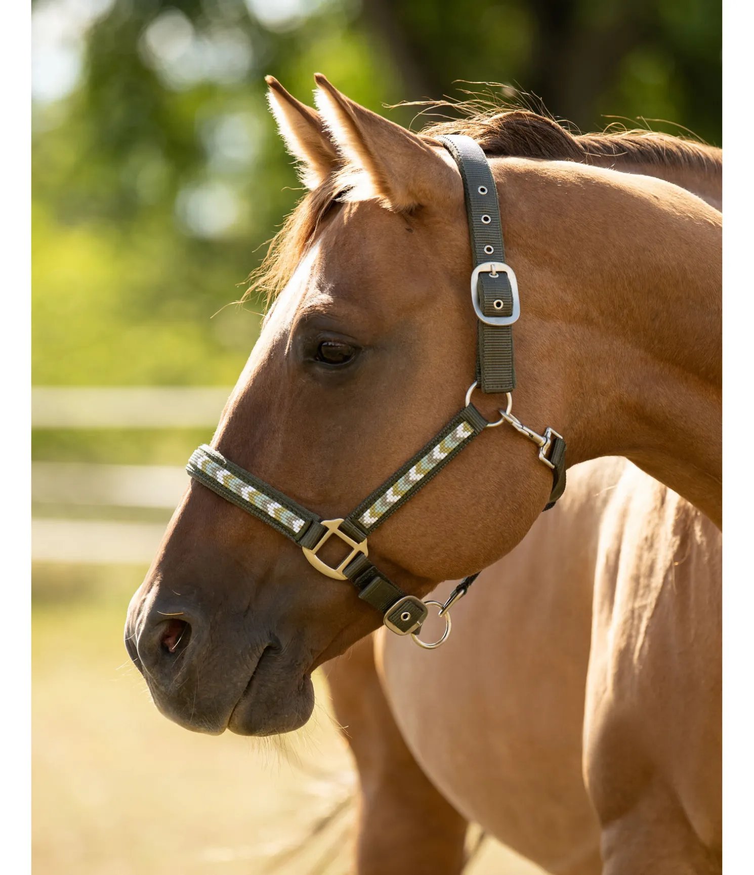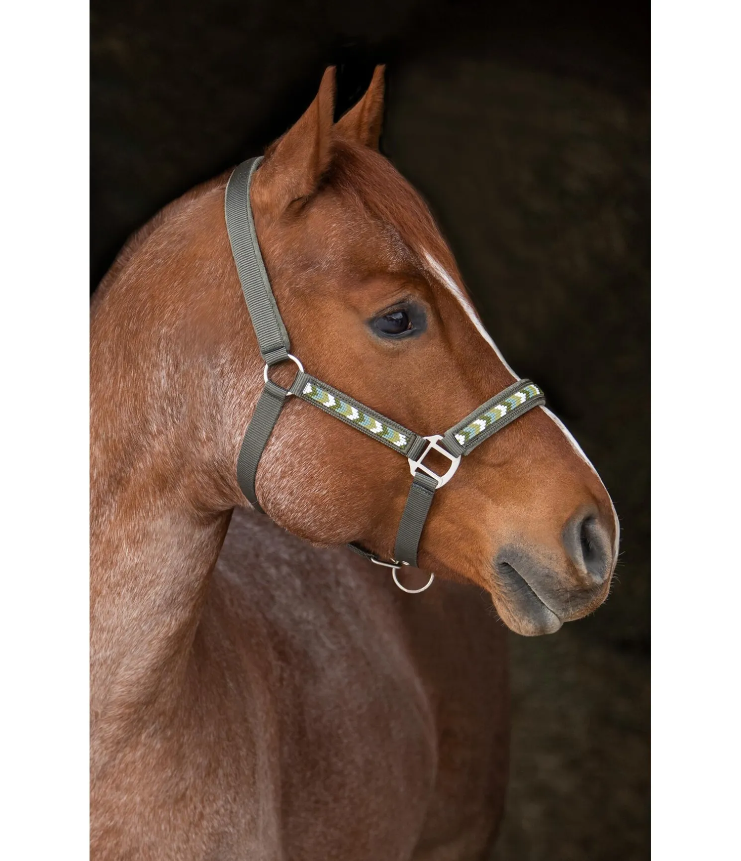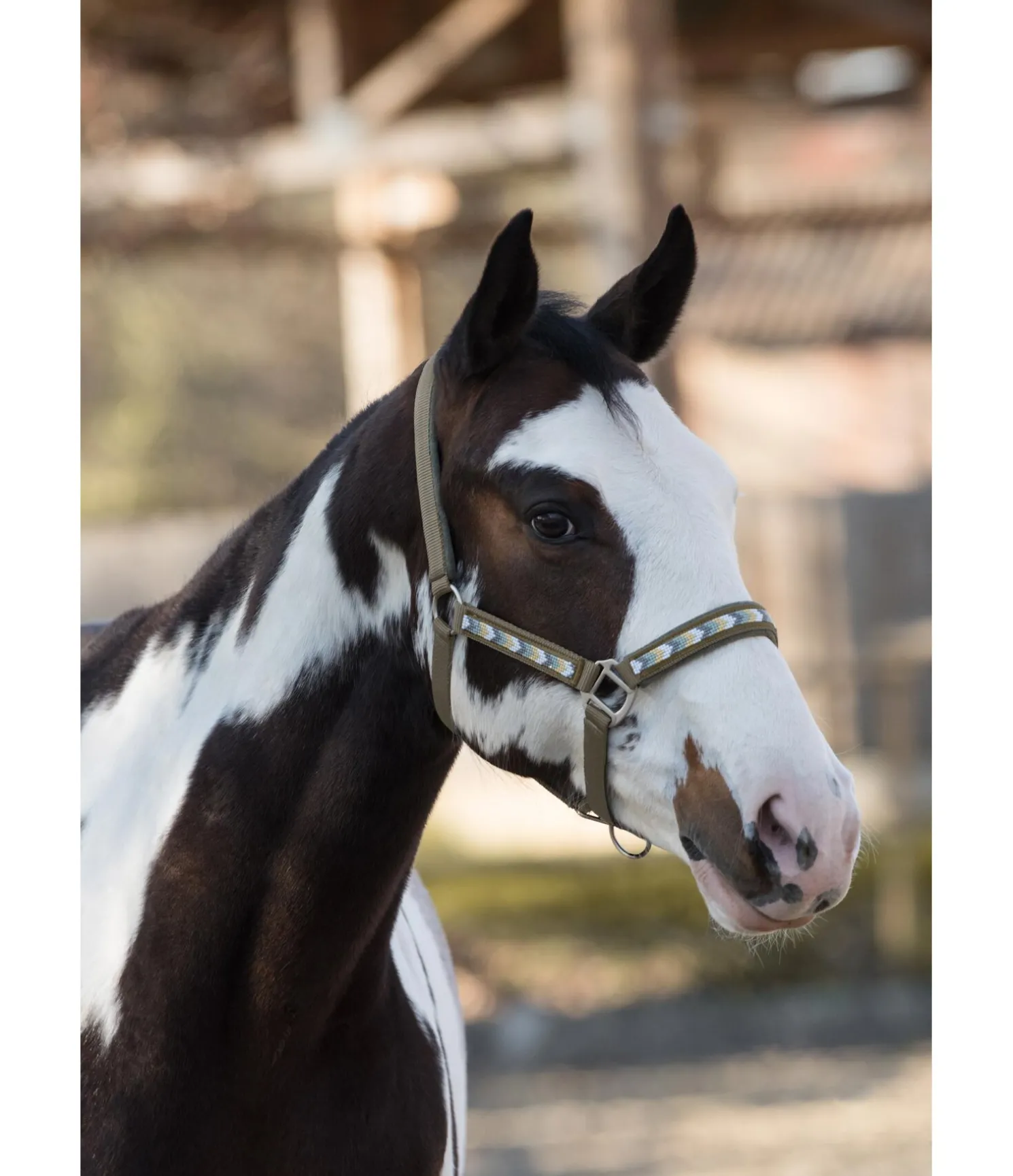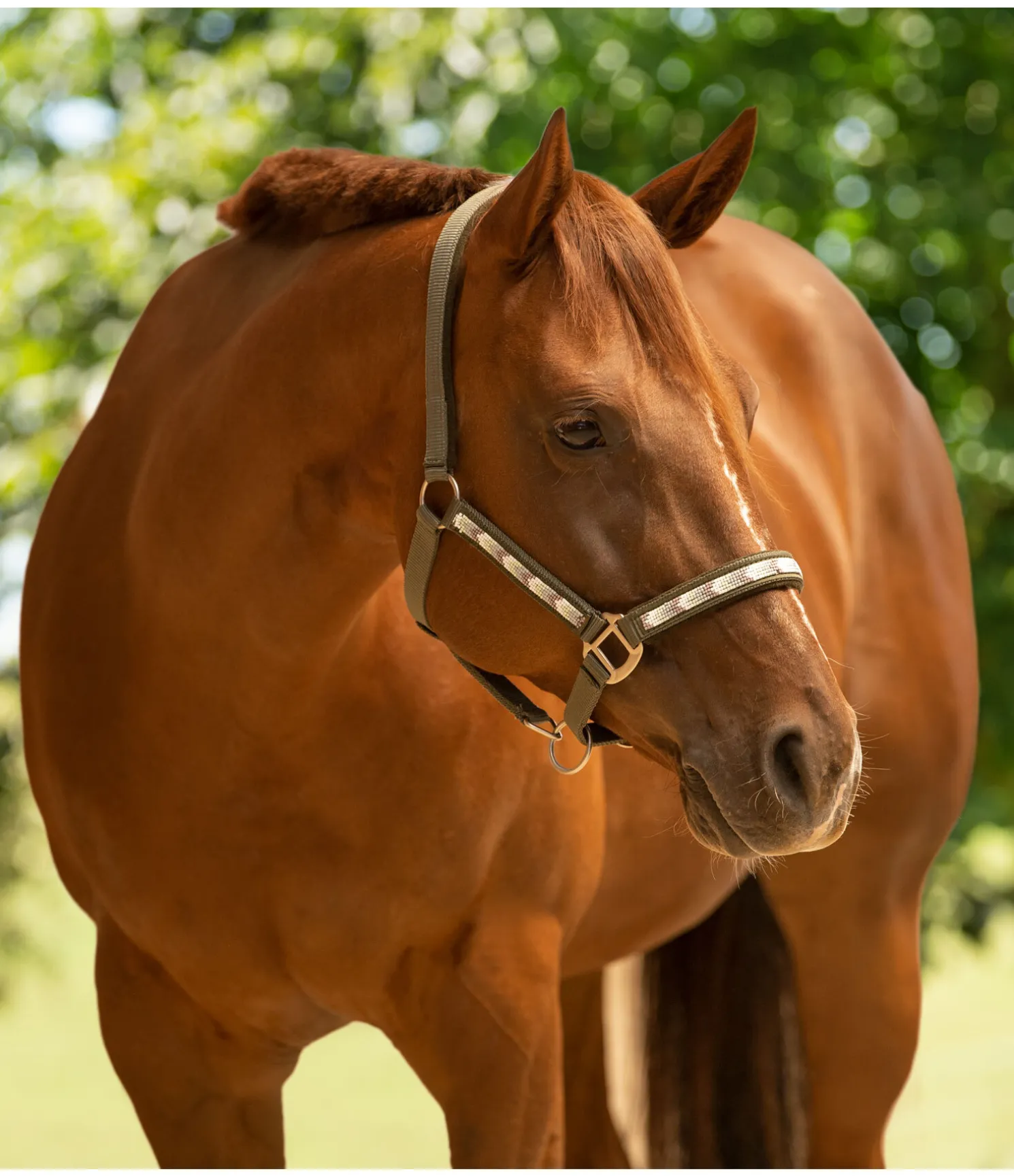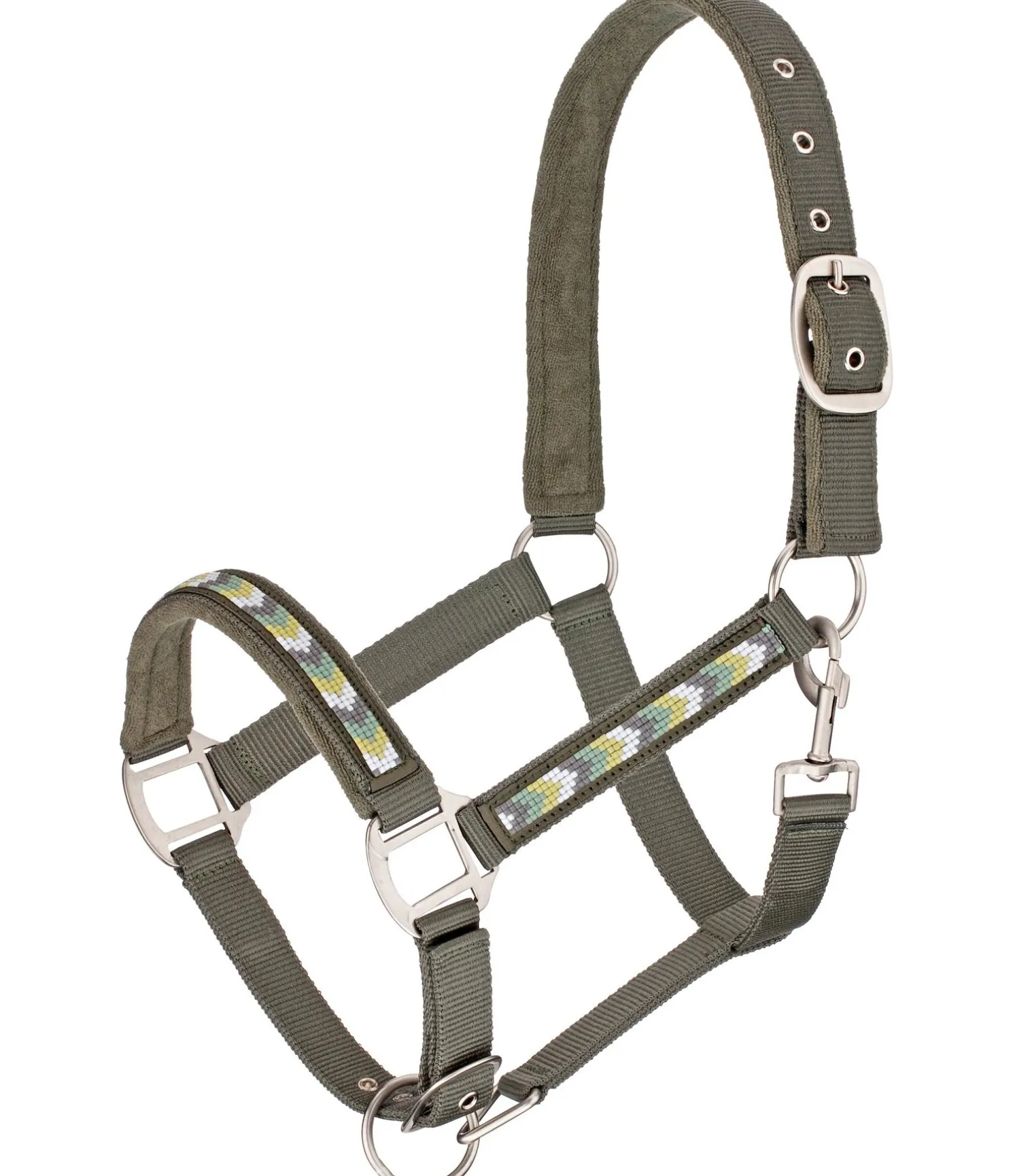 Licol en nylon avec décoration sophistiquée en perles. Rembourrage doux sur la muserolle et la têtière. Muserolle et têtière réglables.