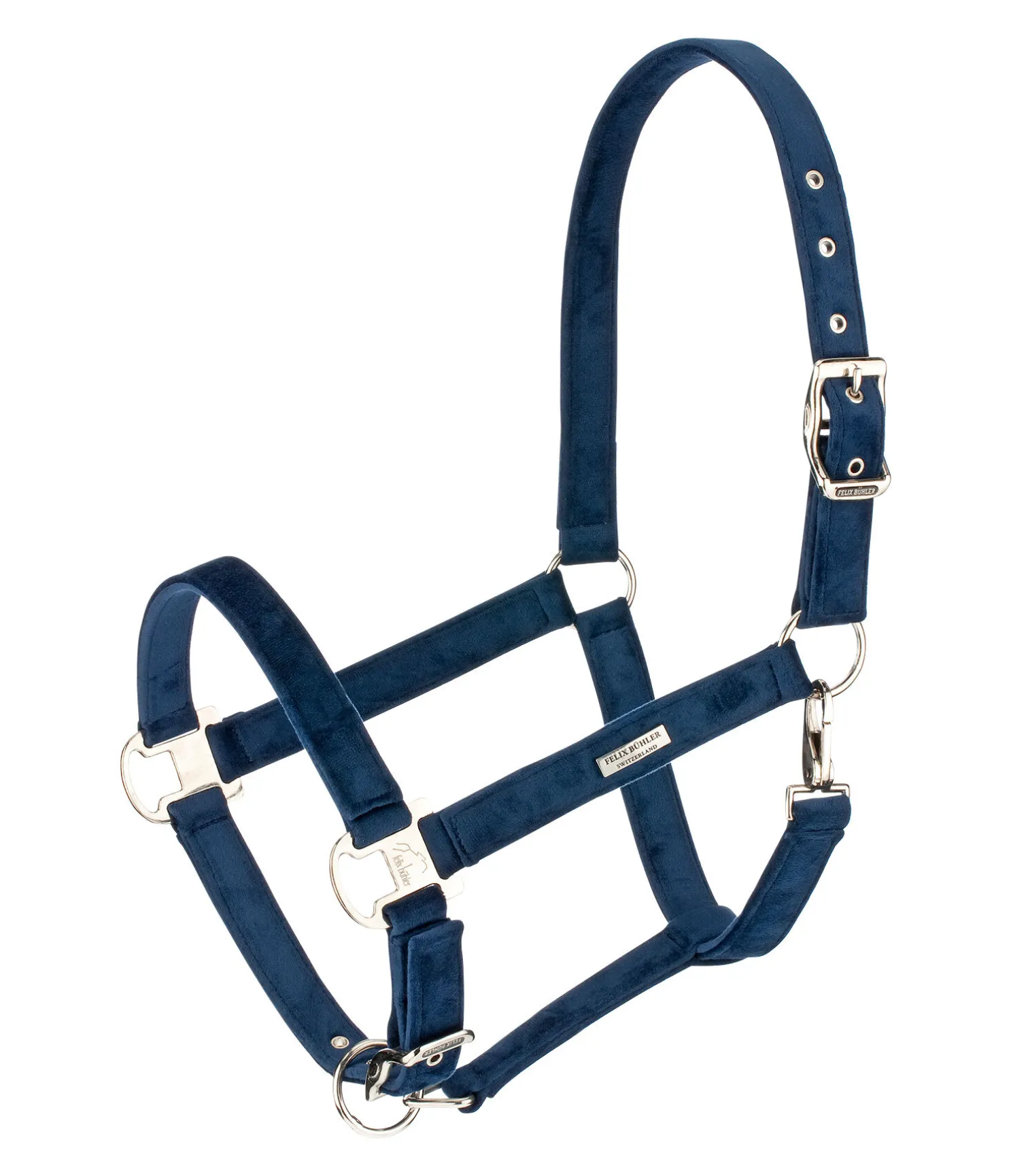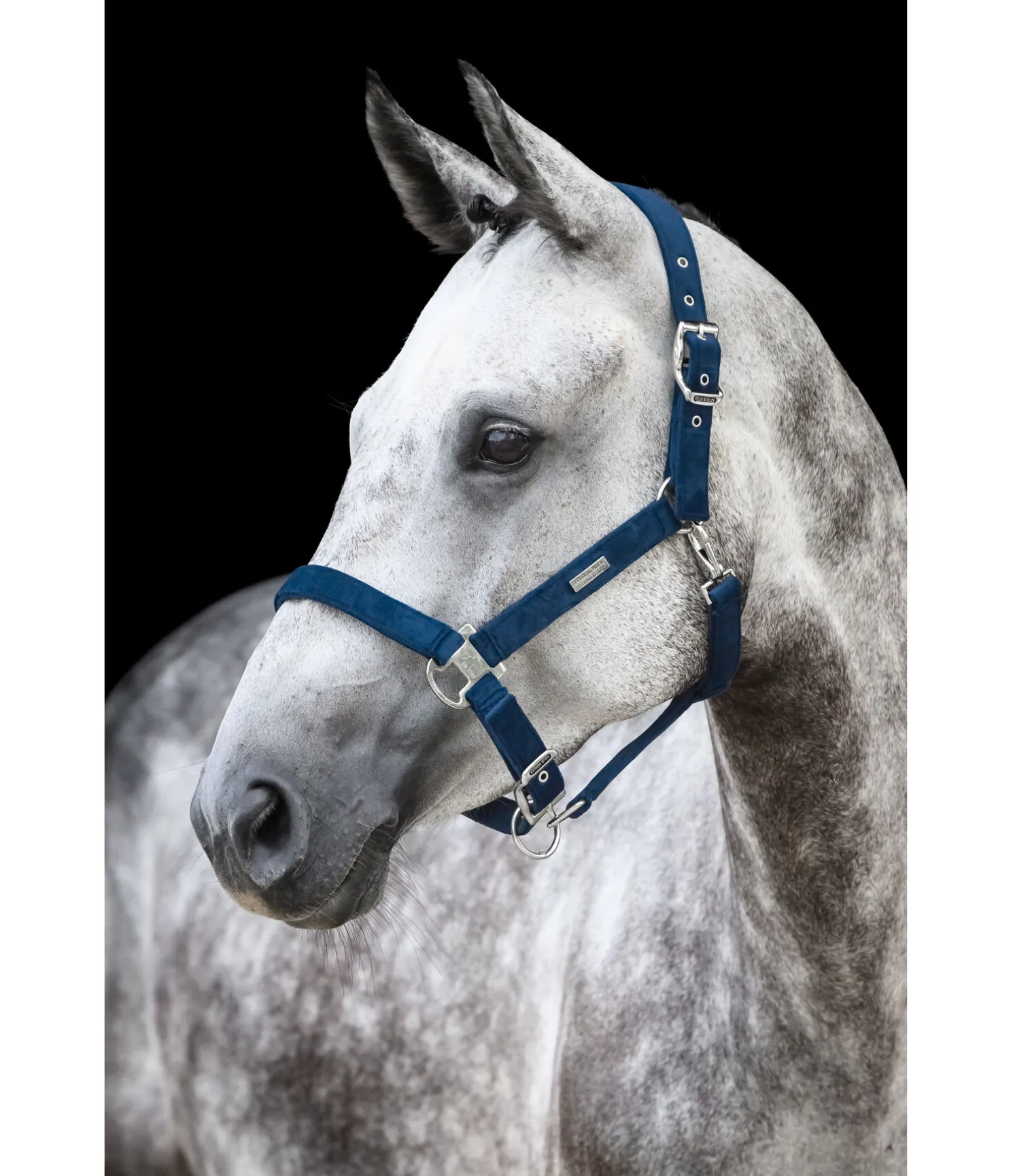 Élégant licol entièrement doublé en matière satinée. Avec plaque logo métallique brillante. Têtière et muserolle réglables. 100 % polypropylène.